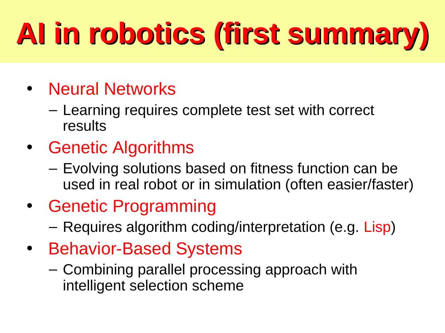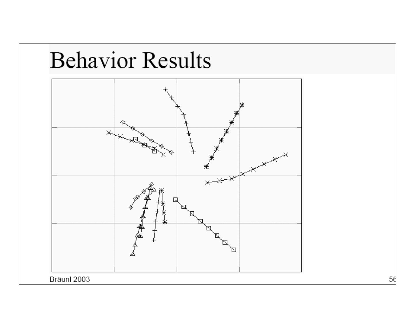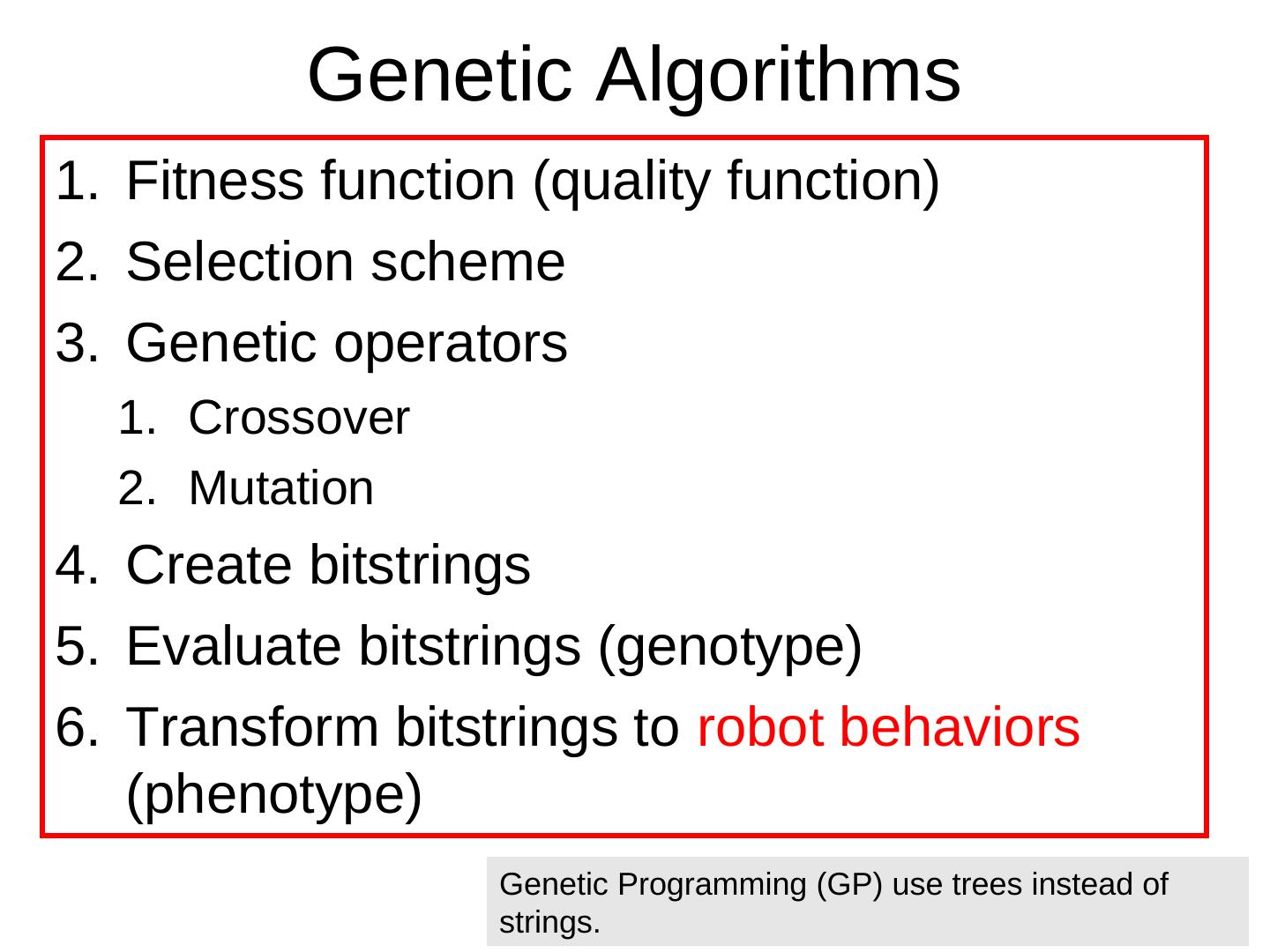 7 . Genetic Algorithms 1. Fitness function (quality function) 2. Selection scheme 3. Genetic operators 1. Crossover 2. Mutation 4. Create bitstrings 5. Evaluate bitstrings (genotype) 6. Transform bitstrings to robot behaviors (phenotype) Genetic Programming (GP) use trees instead of strings.