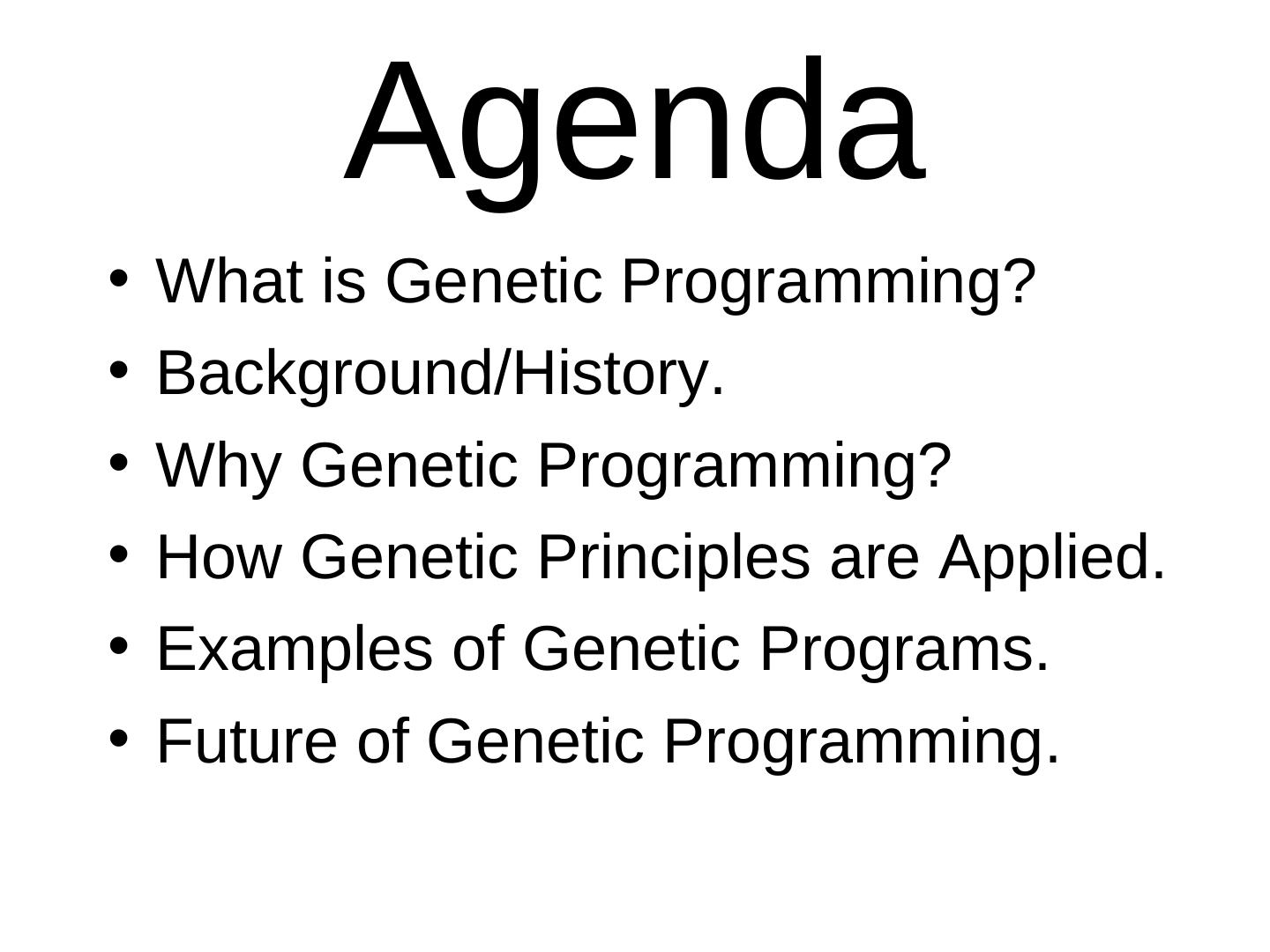 9 . Agenda • What is Genetic Programming? • Background/History. • Why Genetic Programming? • How Genetic Principles are Applied. • Examples of Genetic Programs. • Future of Genetic Programming.