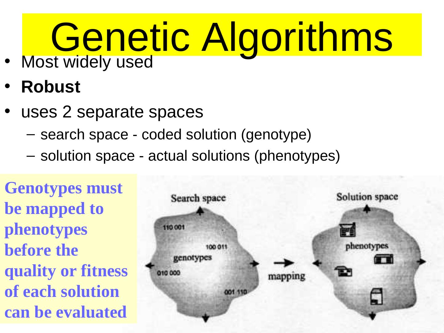10 . Genetic • Most widely used Algorithms • Robust • uses 2 separate spaces – search space - coded solution (genotype) – solution space - actual solutions (phenotypes) Genotypes must be mapped to phenotypes before the quality or fitness of each solution can be evaluated