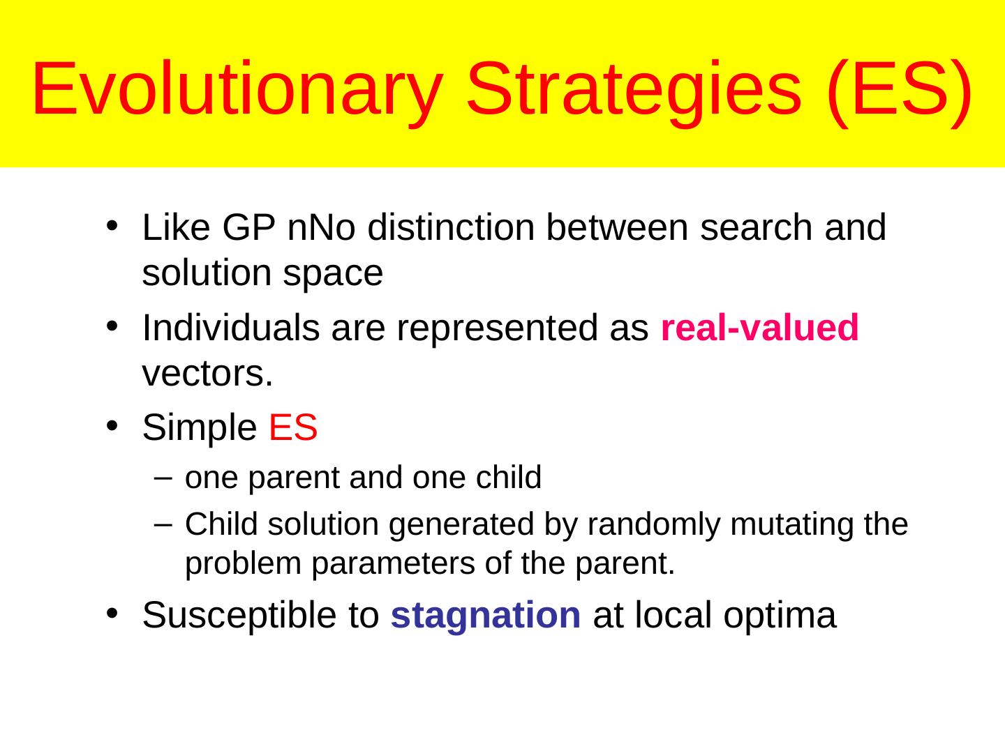 12 .Evolutionary Strategies (ES) • Like GP nNo distinction between search and solution space • Individuals are represented as real-valued vectors. • Simple ES – one parent and one child – Child solution generated by randomly mutating the problem parameters of the parent. • Susceptible to stagnation at local optima