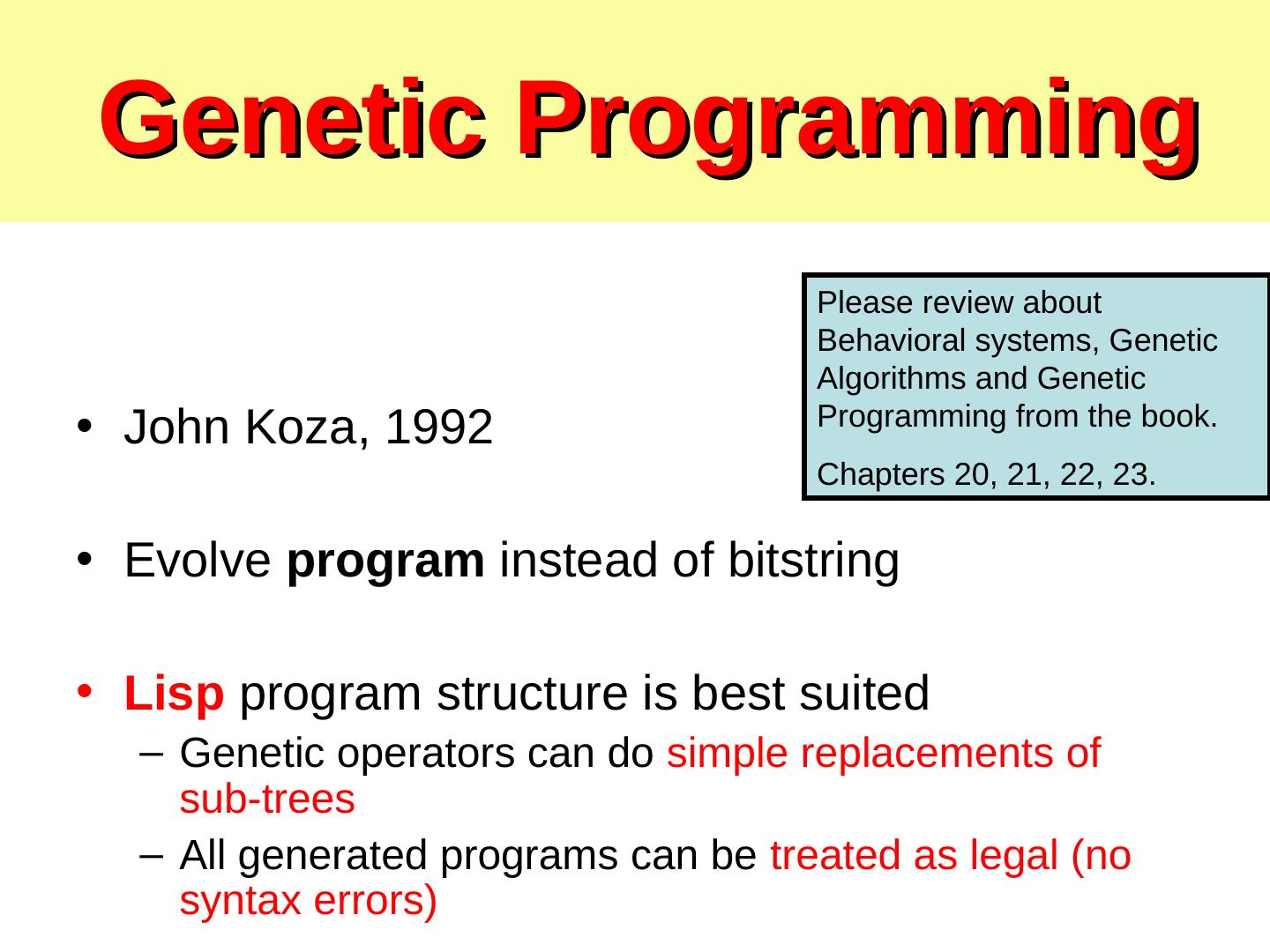 18 .Genetic Programming Please review about Behavioral systems, Genetic Algorithms and Genetic • John Koza, 1992 Programming from the book. Chapters 20, 21, 22, 23. • Evolve program instead of bitstring • Lisp program structure is best suited – Genetic operators can do simple replacements of sub-trees – All generated programs can be treated as legal (no syntax errors)