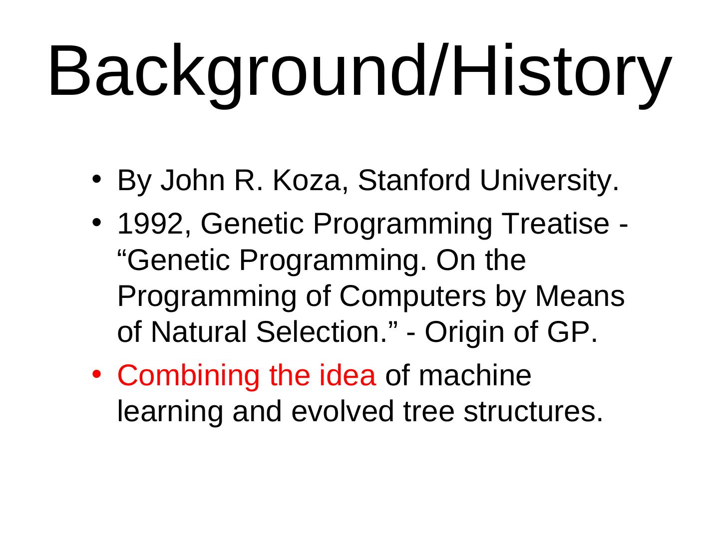 20 .Background/History • By John R. Koza, Stanford University. • 1992, Genetic Programming Treatise - “Genetic Programming. On the Programming of Computers by Means of Natural Selection.” - Origin of GP. • Combining the idea of machine learning and evolved tree structures.