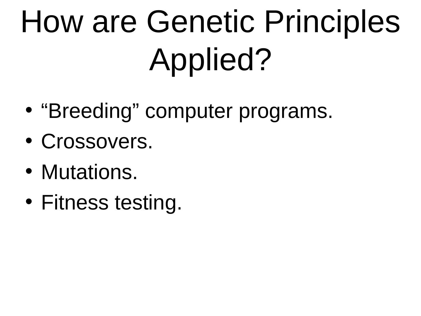 23 .How are Genetic Principles Applied? • “Breeding” computer programs. • Crossovers. • Mutations. • Fitness testing.