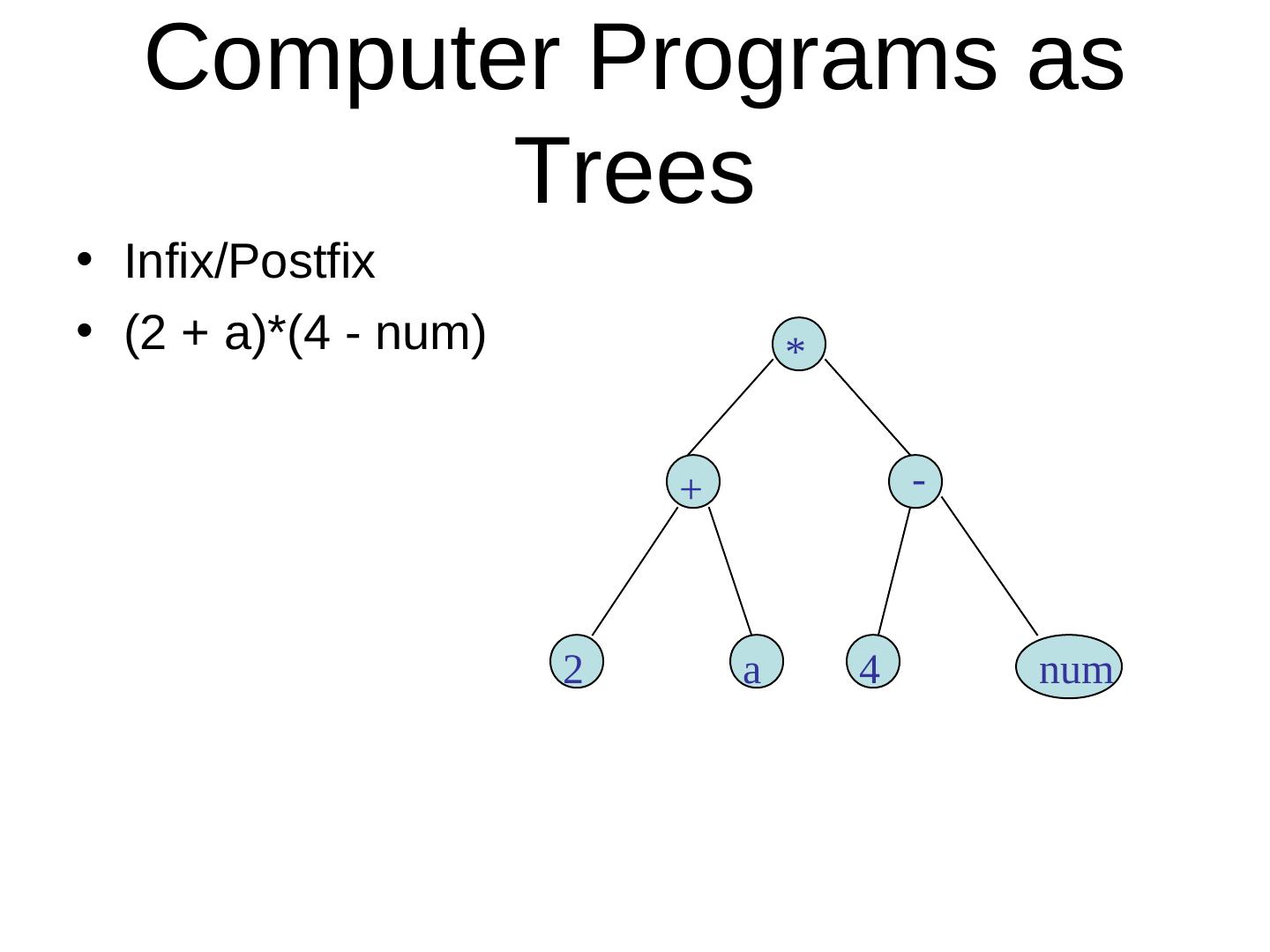 24 . Computer Programs as Trees • Infix/Postfix • (2 + a)*(4 - num) * + - 2 a 4 num