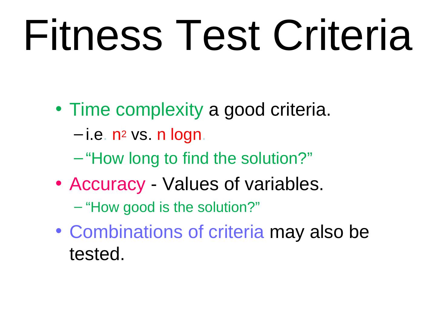28 .Fitness Test Criteria • Time complexity a good criteria. – i.e. n2 vs. n logn. – “How long to find the solution?” • Accuracy - Values of variables. – “How good is the solution?” • Combinations of criteria may also be tested.
