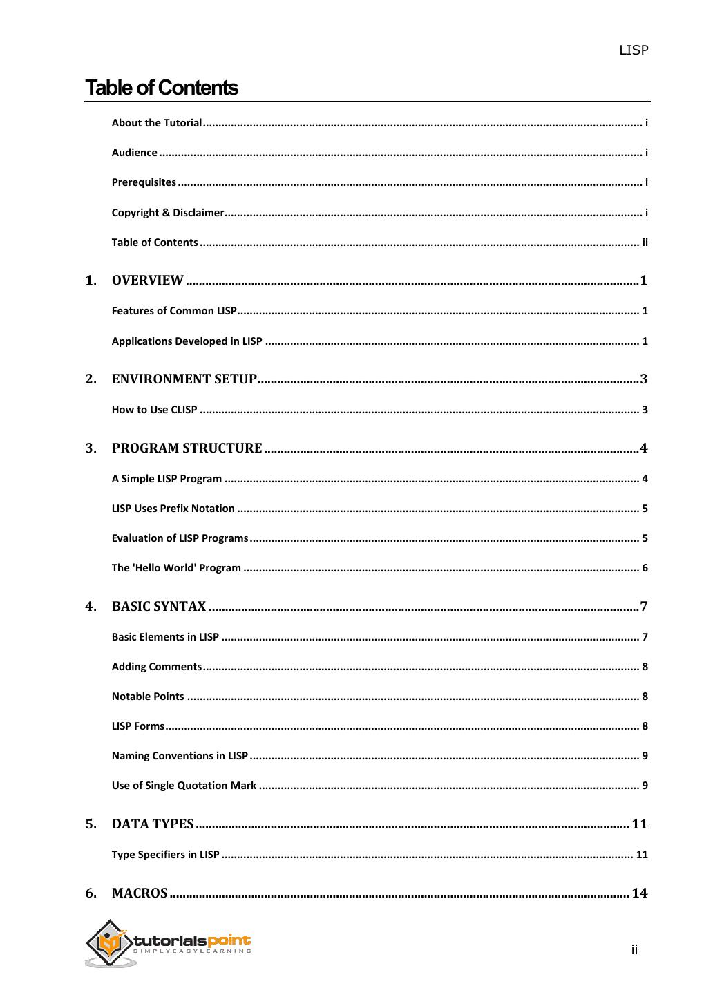 3 . LISP Table of Contents About the Tutorial ............................................................................................................................................. i Audience ........................................................................................................................................................... i Prerequisites ..................................................................................................................................................... i Copyright & Disclaimer...................................................................................................................................... i Table of Contents ............................................................................................................................................. ii 1. OVERVIEW ........................................................................................................................................... 1 Features of Common LISP................................................................................................................................. 1 Applications Developed in LISP ........................................................................................................................ 1 2. ENVIRONMENT SETUP ..................................................................................................................... 3 How to Use CLISP ............................................................................................................................................. 3 3. PROGRAM STRUCTURE ................................................................................................................... 4 A Simple LISP Program ..................................................................................................................................... 4 LISP Uses Prefix Notation ................................................................................................................................. 5 Evaluation of LISP Programs ............................................................................................................................. 5 The 'Hello World' Program ............................................................................................................................... 6 4. BASIC SYNTAX .................................................................................................................................... 7 Basic Elements in LISP ...................................................................................................................................... 7 Adding Comments ............................................................................................................................................ 8 Notable Points ................................................................................................................................................. 8 LISP Forms ........................................................................................................................................................ 8 Naming Conventions in LISP ............................................................................................................................. 9 Use of Single Quotation Mark .......................................................................................................................... 9 5. DATA TYPES ..................................................................................................................................... 11 Type Specifiers in LISP .................................................................................................................................... 11 6. MACROS ............................................................................................................................................. 14 ii