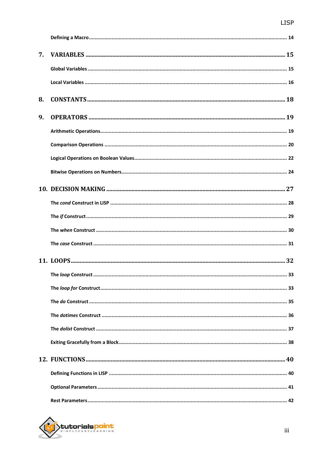 4 . LISP Defining a Macro ............................................................................................................................................ 14 7. VARIABLES ....................................................................................................................................... 15 Global Variables ............................................................................................................................................. 15 Local Variables ............................................................................................................................................... 16 8. CONSTANTS ...................................................................................................................................... 18 9. OPERATORS ..................................................................................................................................... 19 Arithmetic Operations.................................................................................................................................... 19 Comparison Operations ................................................................................................................................. 20 Logical Operations on Boolean Values............................................................................................................ 22 Bitwise Operations on Numbers..................................................................................................................... 24 10. DECISION MAKING ......................................................................................................................... 27 The cond Construct in LISP ............................................................................................................................. 28 The if Construct .............................................................................................................................................. 29 The when Construct ....................................................................................................................................... 30 The case Construct ......................................................................................................................................... 31 11. LOOPS ................................................................................................................................................. 32 The loop Construct ......................................................................................................................................... 33 The loop for Construct .................................................................................................................................... 33 The do Construct ............................................................................................................................................ 35 The dotimes Construct ................................................................................................................................... 36 The dolist Construct ....................................................................................................................................... 37 Exiting Gracefully from a Block ....................................................................................................................... 38 12. FUNCTIONS ....................................................................................................................................... 40 Defining Functions in LISP .............................................................................................................................. 40 Optional Parameters ...................................................................................................................................... 41 Rest Parameters ............................................................................................................................................. 42 iii