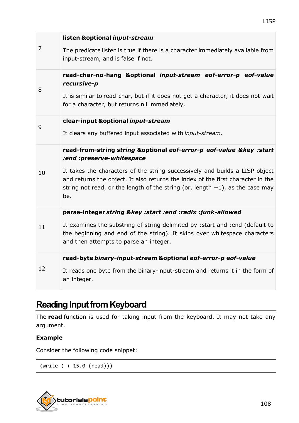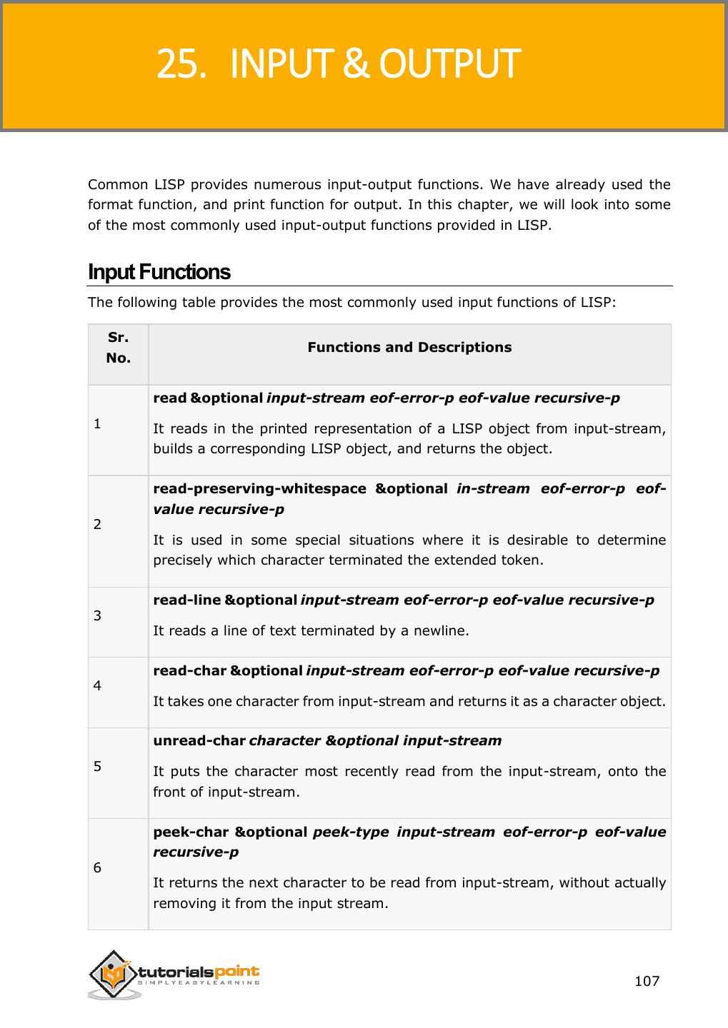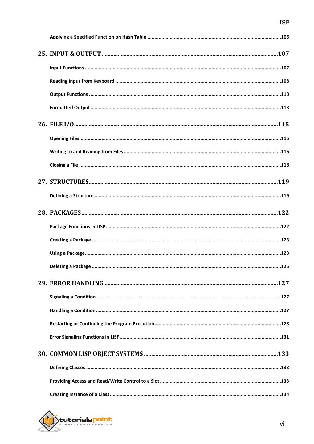 7 . LISP Applying a Specified Function on Hash Table ................................................................................................106 25. INPUT & OUTPUT .........................................................................................................................107 Input Functions .............................................................................................................................................107 Reading Input from Keyboard .......................................................................................................................108 Output Functions ..........................................................................................................................................110 Formatted Output .........................................................................................................................................113 26. FILE I/O ............................................................................................................................................115 Opening Files.................................................................................................................................................115 Writing to and Reading from Files .................................................................................................................116 Closing a File .................................................................................................................................................118 27. STRUCTURES..................................................................................................................................119 Defining a Structure ......................................................................................................................................119 28. PACKAGES .......................................................................................................................................122 Package Functions in LISP ..............................................................................................................................122 Creating a Package ........................................................................................................................................123 Using a Package.............................................................................................................................................123 Deleting a Package ........................................................................................................................................125 29. ERROR HANDLING .......................................................................................................................127 Signaling a Condition .....................................................................................................................................127 Handling a Condition .....................................................................................................................................127 Restarting or Continuing the Program Execution ...........................................................................................128 Error Signaling Functions in LISP ....................................................................................................................131 30. COMMON LISP OBJECT SYSTEMS ............................................................................................133 Defining Classes ............................................................................................................................................133 Providing Access and Read/Write Control to a Slot .......................................................................................133 Creating Instance of a Class ...........................................................................................................................134 vi
