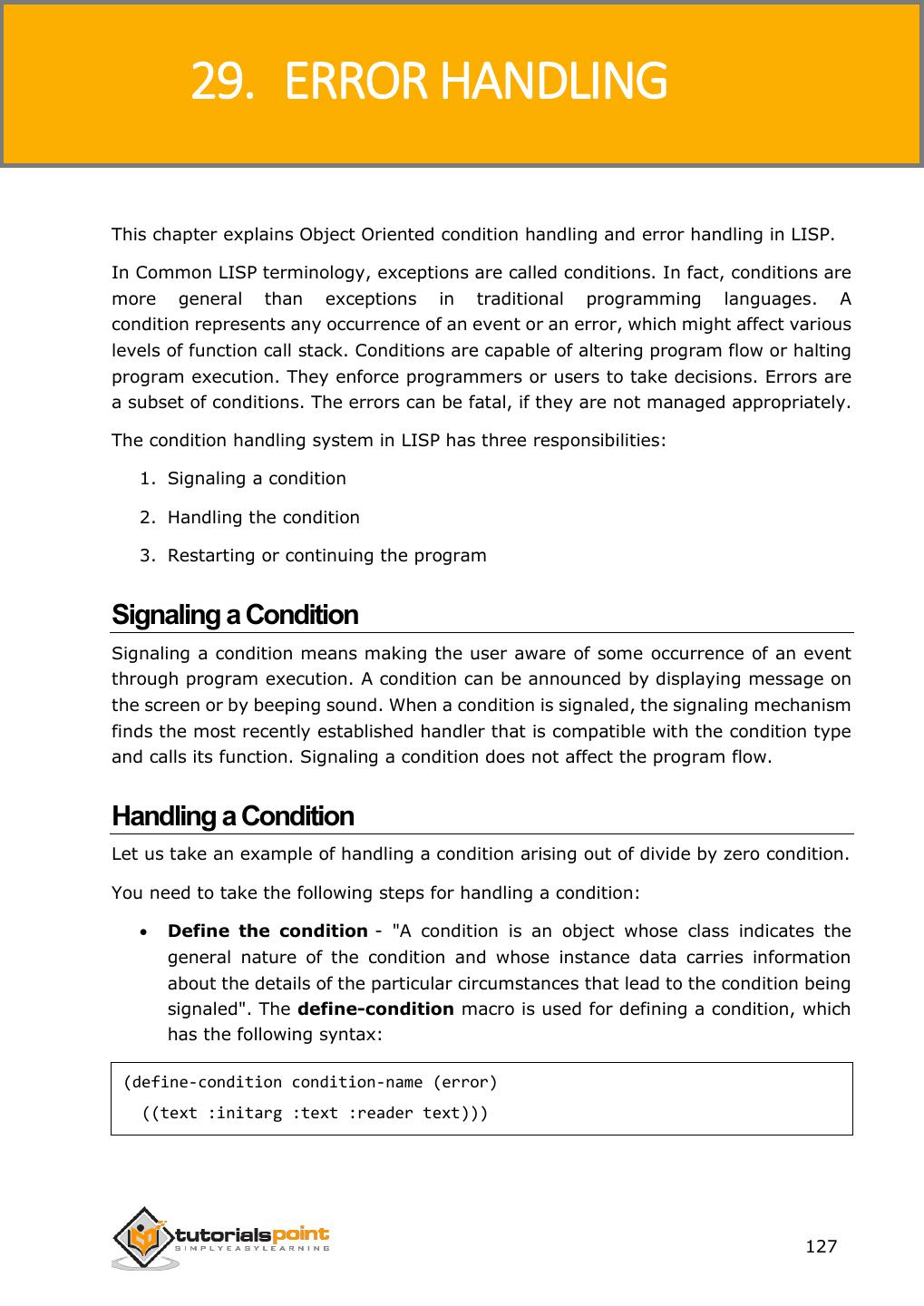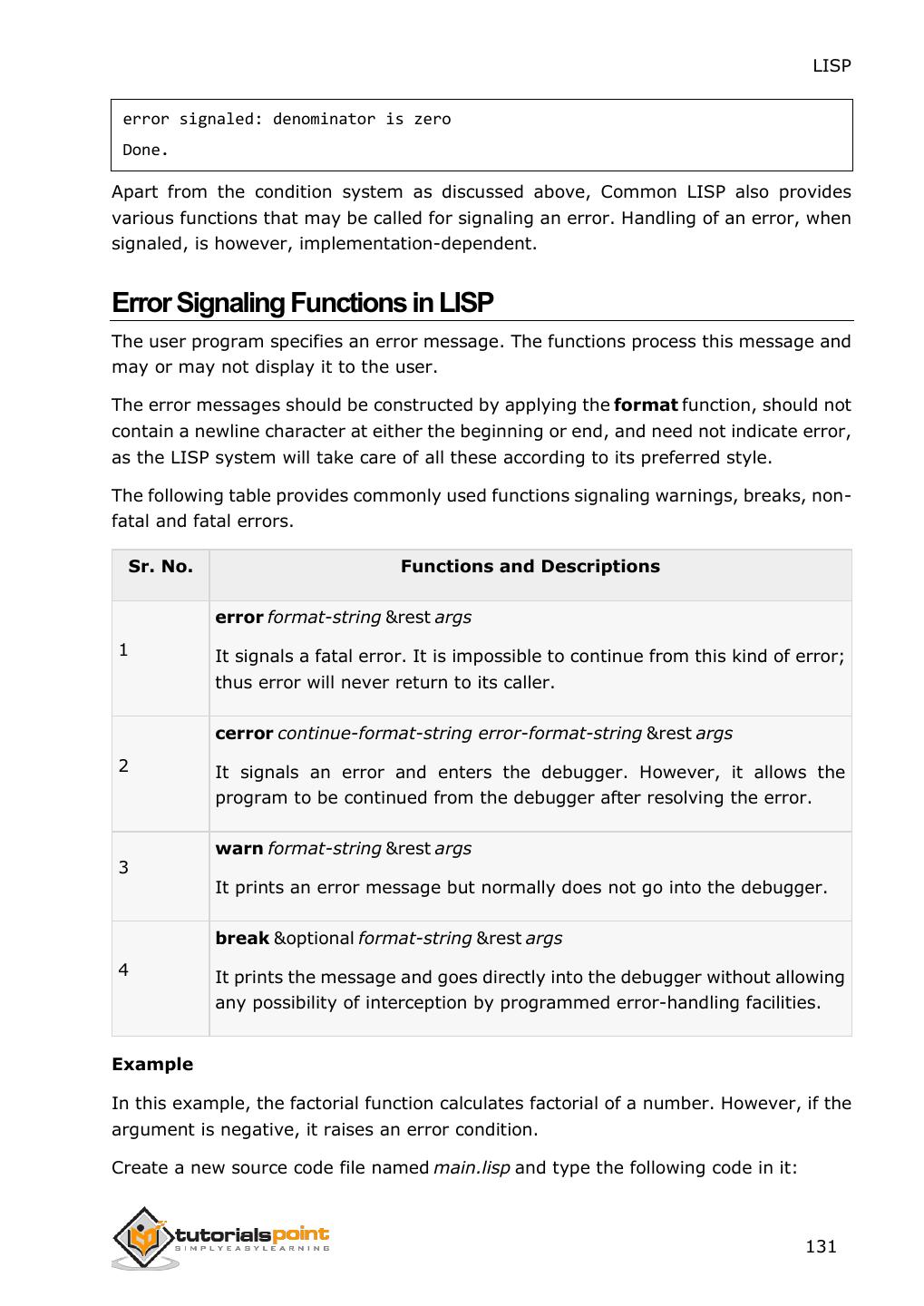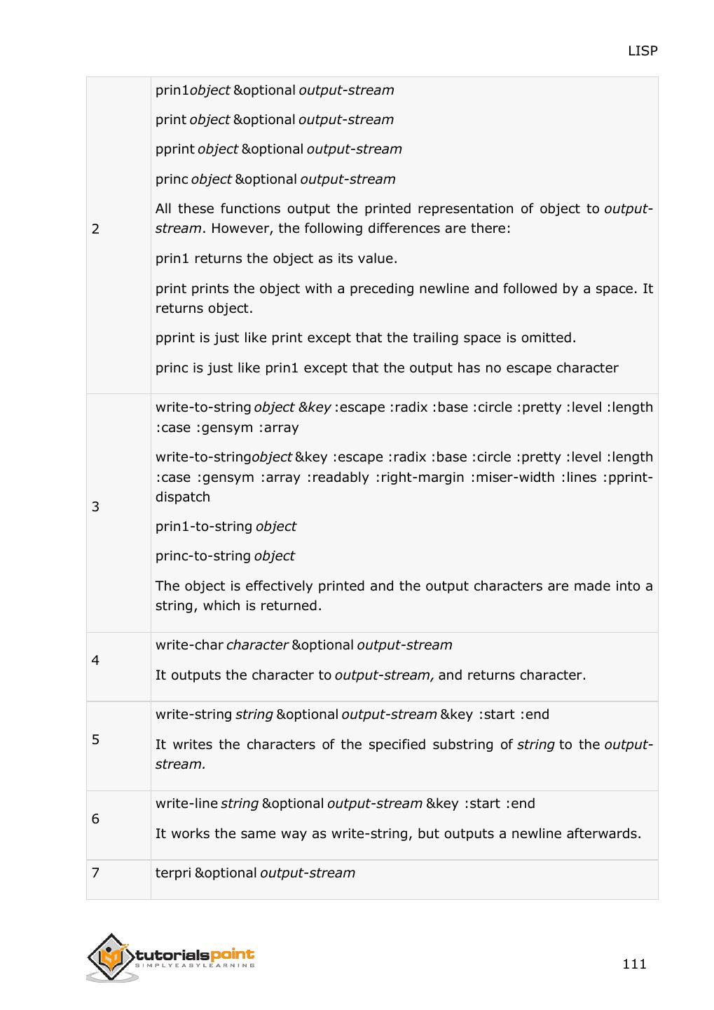 7 . LISP Applying a Specified Function on Hash Table ................................................................................................106 25. INPUT & OUTPUT .........................................................................................................................107 Input Functions .............................................................................................................................................107 Reading Input from Keyboard .......................................................................................................................108 Output Functions ..........................................................................................................................................110 Formatted Output .........................................................................................................................................113 26. FILE I/O ............................................................................................................................................115 Opening Files.................................................................................................................................................115 Writing to and Reading from Files .................................................................................................................116 Closing a File .................................................................................................................................................118 27. STRUCTURES..................................................................................................................................119 Defining a Structure ......................................................................................................................................119 28. PACKAGES .......................................................................................................................................122 Package Functions in LISP ..............................................................................................................................122 Creating a Package ........................................................................................................................................123 Using a Package.............................................................................................................................................123 Deleting a Package ........................................................................................................................................125 29. ERROR HANDLING .......................................................................................................................127 Signaling a Condition .....................................................................................................................................127 Handling a Condition .....................................................................................................................................127 Restarting or Continuing the Program Execution ...........................................................................................128 Error Signaling Functions in LISP ....................................................................................................................131 30. COMMON LISP OBJECT SYSTEMS ............................................................................................133 Defining Classes ............................................................................................................................................133 Providing Access and Read/Write Control to a Slot .......................................................................................133 Creating Instance of a Class ...........................................................................................................................134 vi