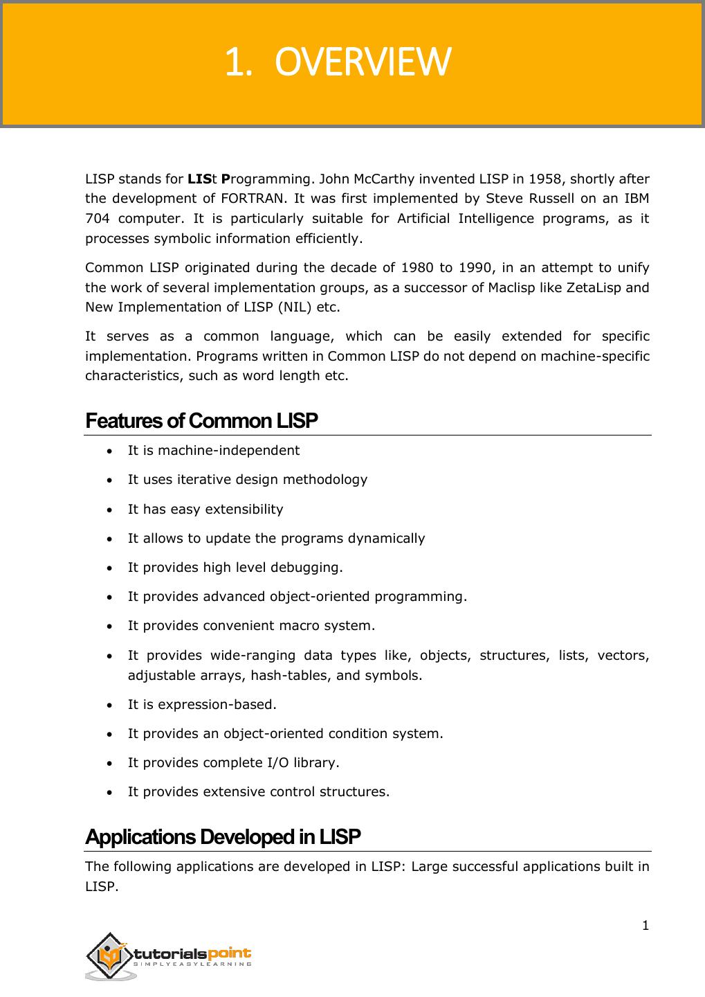 9 . 1. OVERVIEW LISP stands for LISt Programming. John McCarthy invented LISP in 1958, shortly after the development of FORTRAN. It was first implemented by Steve Russell on an IBM 704 computer. It is particularly suitable for Artificial Intelligence programs, as it processes symbolic information efficiently. Common LISP originated during the decade of 1980 to 1990, in an attempt to unify the work of several implementation groups, as a successor of Maclisp like ZetaLisp and New Implementation of LISP (NIL) etc. It serves as a common language, which can be easily extended for specific implementation. Programs written in Common LISP do not depend on machine-specific characteristics, such as word length etc. Features of Common LISP It is machine-independent It uses iterative design methodology It has easy extensibility It allows to update the programs dynamically It provides high level debugging. It provides advanced object-oriented programming. It provides convenient macro system. It provides wide-ranging data types like, objects, structures, lists, vectors, adjustable arrays, hash-tables, and symbols. It is expression-based. It provides an object-oriented condition system. It provides complete I/O library. It provides extensive control structures. Applications Developed in LISP The following applications are developed in LISP: Large successful applications built in LISP. 1