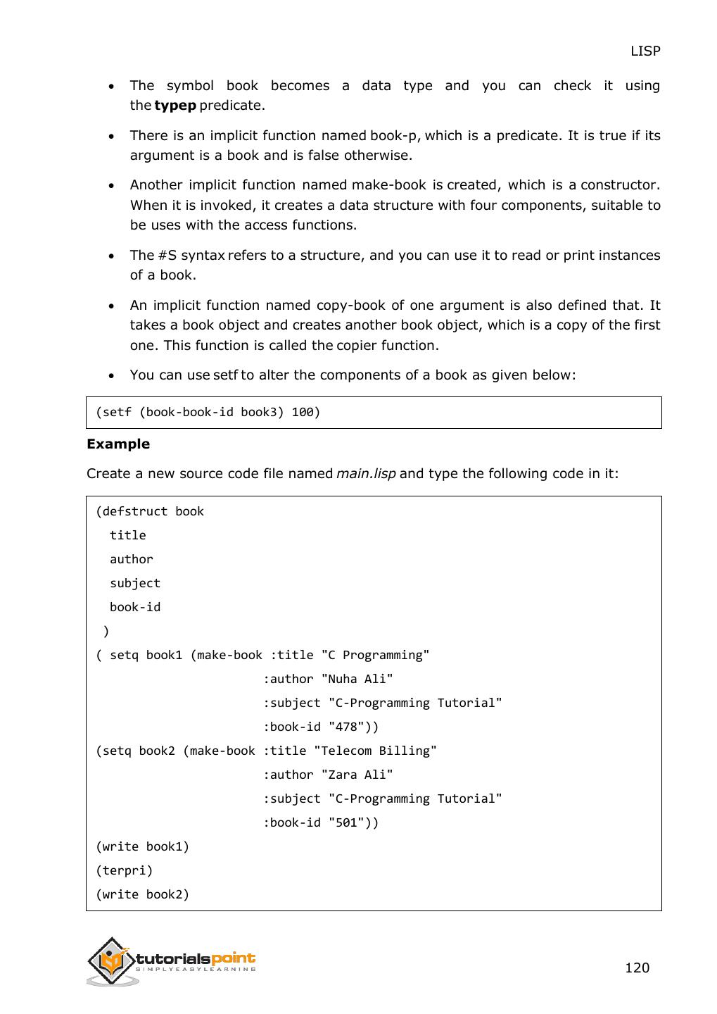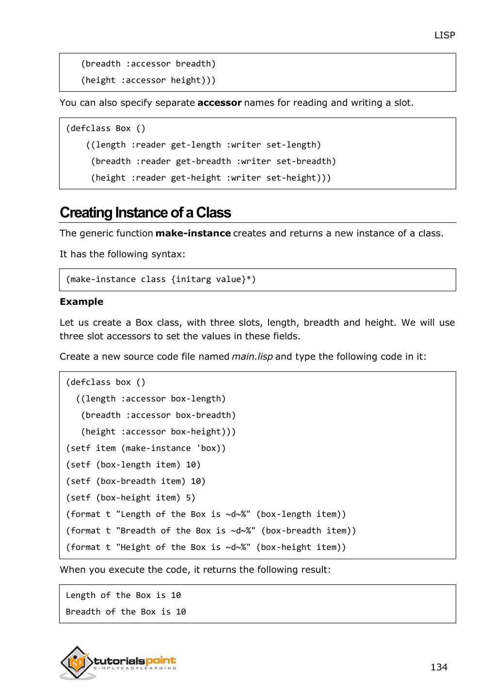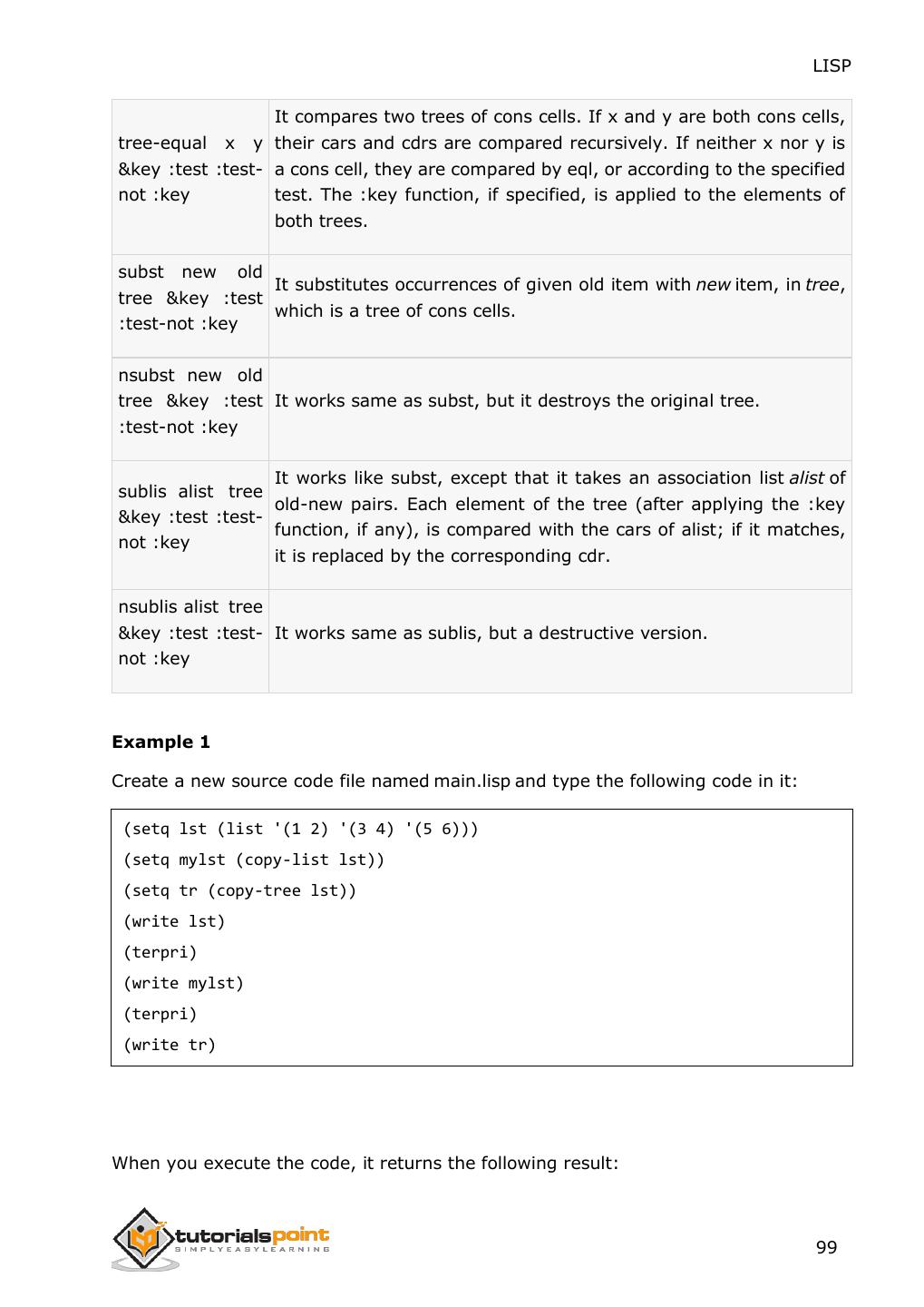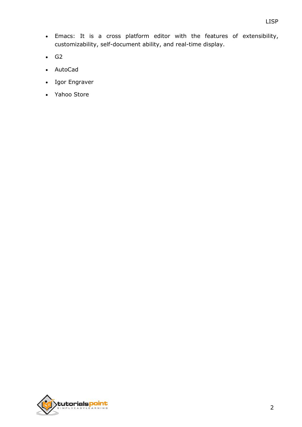 2 .About the Tutorial LISP is the second-oldest high-level programming language after Fortran and has changed a great deal since its early days, and a number of dialects have existed over its history. Today, the most widely known general-purpose LISP dialects are Common LISP and Scheme. This tutorial takes you through features of LISP Programming language by simple and practical approach of learning. Audience This reference has been prepared for the beginners to help them understand the basic to advanced concepts related to LISP Programming language. Prerequisites Before you start doing practice with various types of examples given in this reference, we assume that you are already aware of the fundamentals of computer programming and programming languages. Copyright & Disclaimer Copyright 2014 by Tutorials Point (I) Pvt. Ltd. All the content and graphics published in this e-book are the property of Tutotorials Point (I) Pvt. Ltd. The user of this e-book is prohibited to reuse, retain, copy, distribute or republish any contents or a part of contents of this e-book in any manner without written consent of the publisher. You strive to update the contents of our website and tutorials as timely and as precisely as possible, however, the contents may contain inaccuracies or errors. Tutorials Point (I) Pvt. Ltd. provides no guarantee regarding the accuracy, timeliness or completeness of our website or its contents including this tutorial. If you discover any errors on our website or in this tutorial, please notify us at contact@tutorialspoint.com i