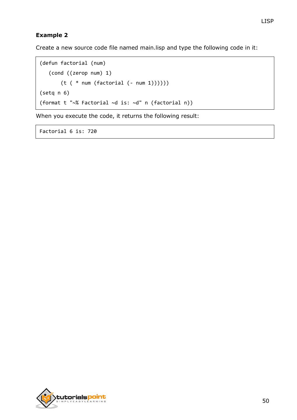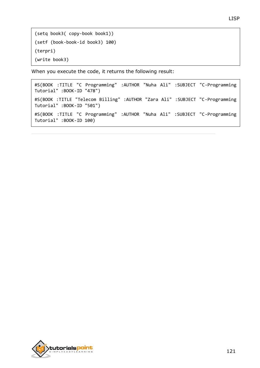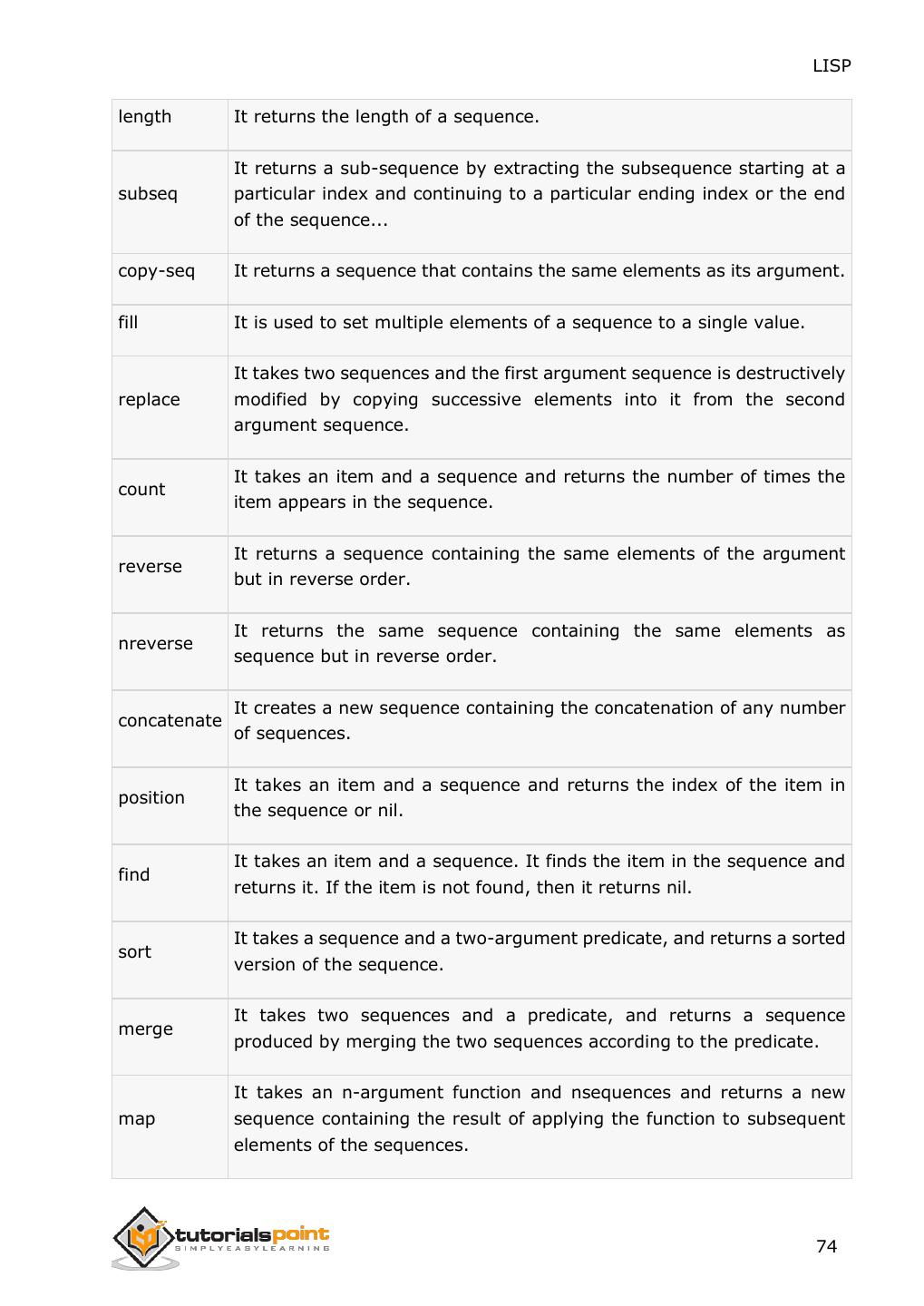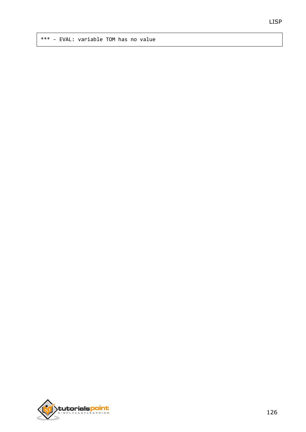 2 .About the Tutorial LISP is the second-oldest high-level programming language after Fortran and has changed a great deal since its early days, and a number of dialects have existed over its history. Today, the most widely known general-purpose LISP dialects are Common LISP and Scheme. This tutorial takes you through features of LISP Programming language by simple and practical approach of learning. Audience This reference has been prepared for the beginners to help them understand the basic to advanced concepts related to LISP Programming language. Prerequisites Before you start doing practice with various types of examples given in this reference, we assume that you are already aware of the fundamentals of computer programming and programming languages. Copyright & Disclaimer Copyright 2014 by Tutorials Point (I) Pvt. Ltd. All the content and graphics published in this e-book are the property of Tutotorials Point (I) Pvt. Ltd. The user of this e-book is prohibited to reuse, retain, copy, distribute or republish any contents or a part of contents of this e-book in any manner without written consent of the publisher. You strive to update the contents of our website and tutorials as timely and as precisely as possible, however, the contents may contain inaccuracies or errors. Tutorials Point (I) Pvt. Ltd. provides no guarantee regarding the accuracy, timeliness or completeness of our website or its contents including this tutorial. If you discover any errors on our website or in this tutorial, please notify us at contact@tutorialspoint.com i