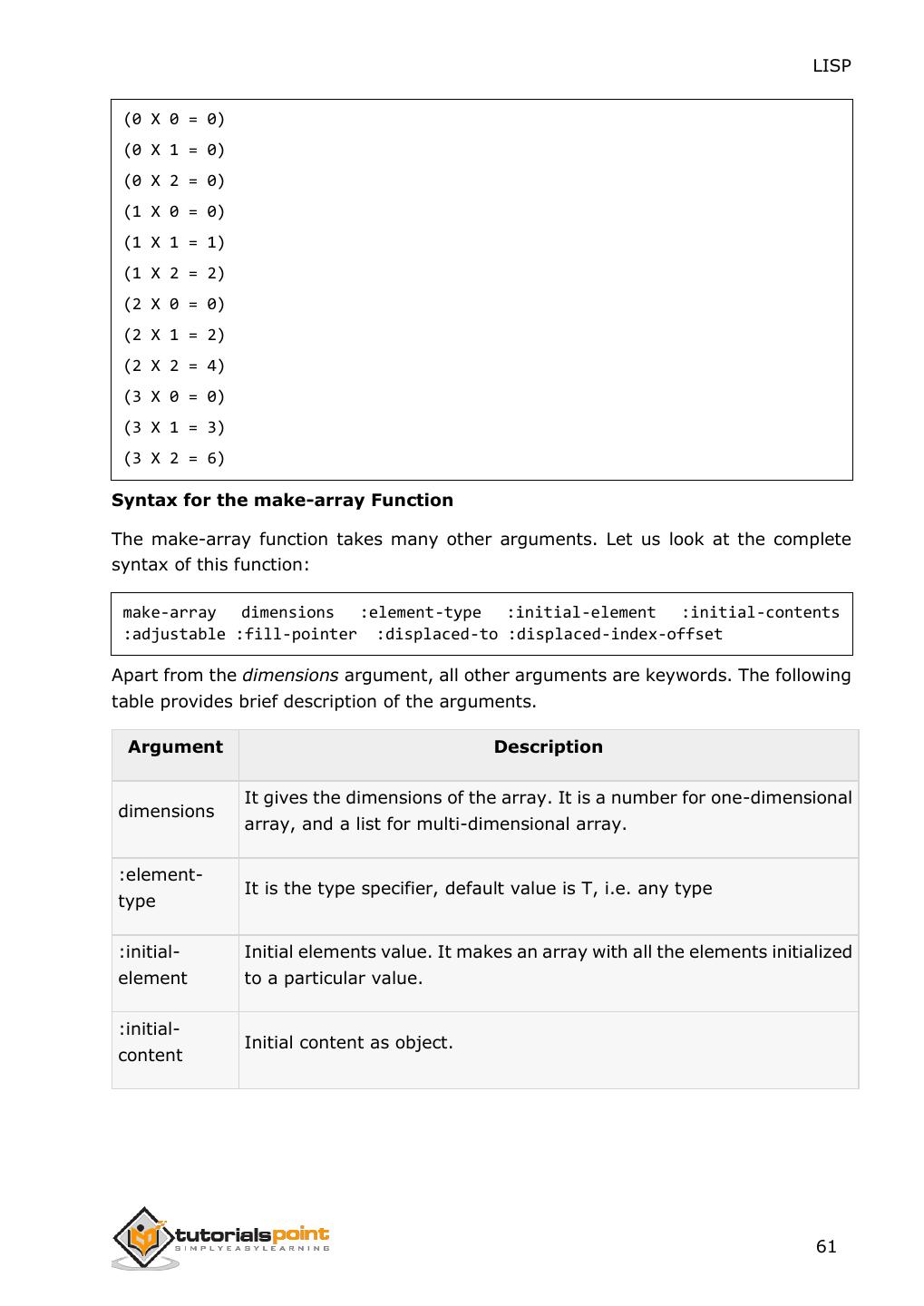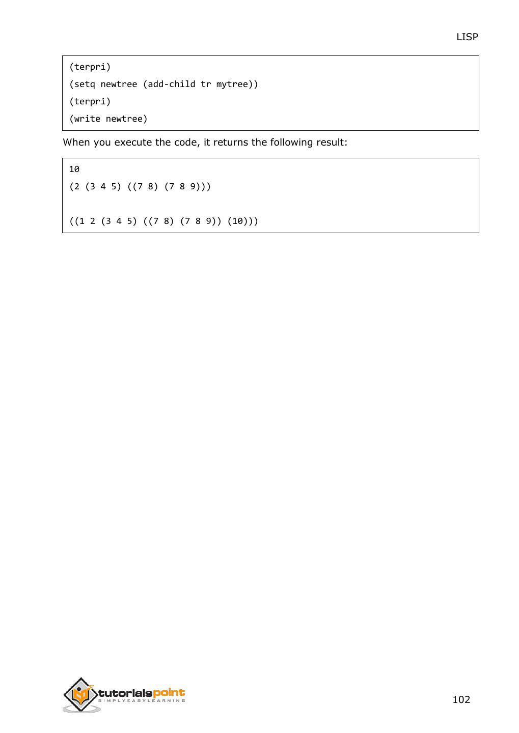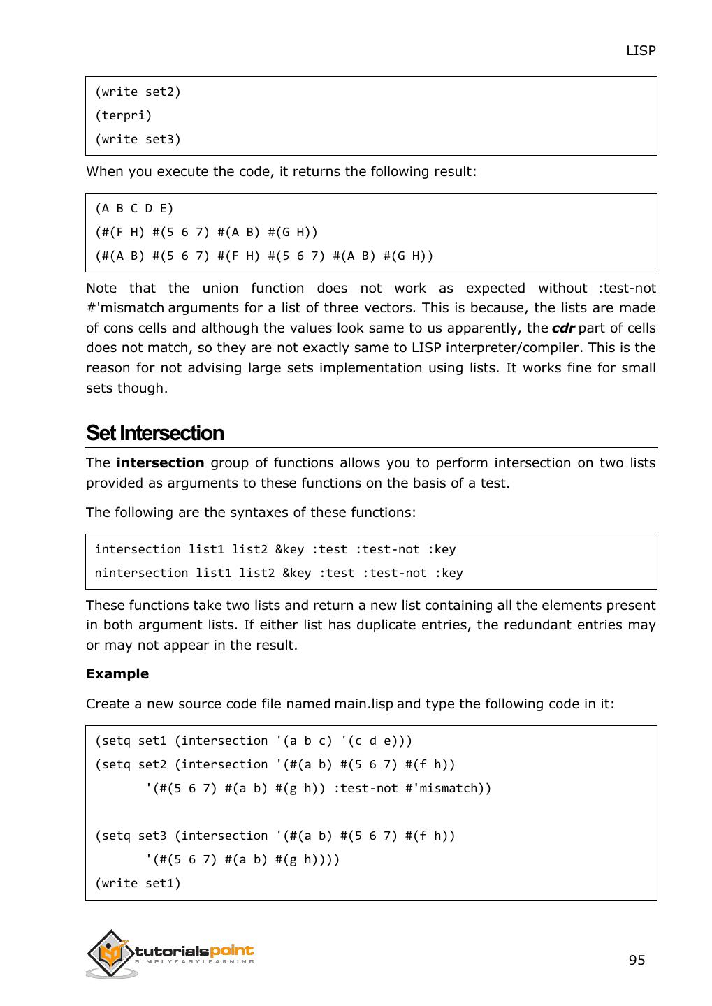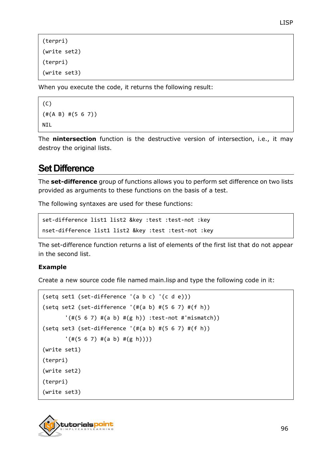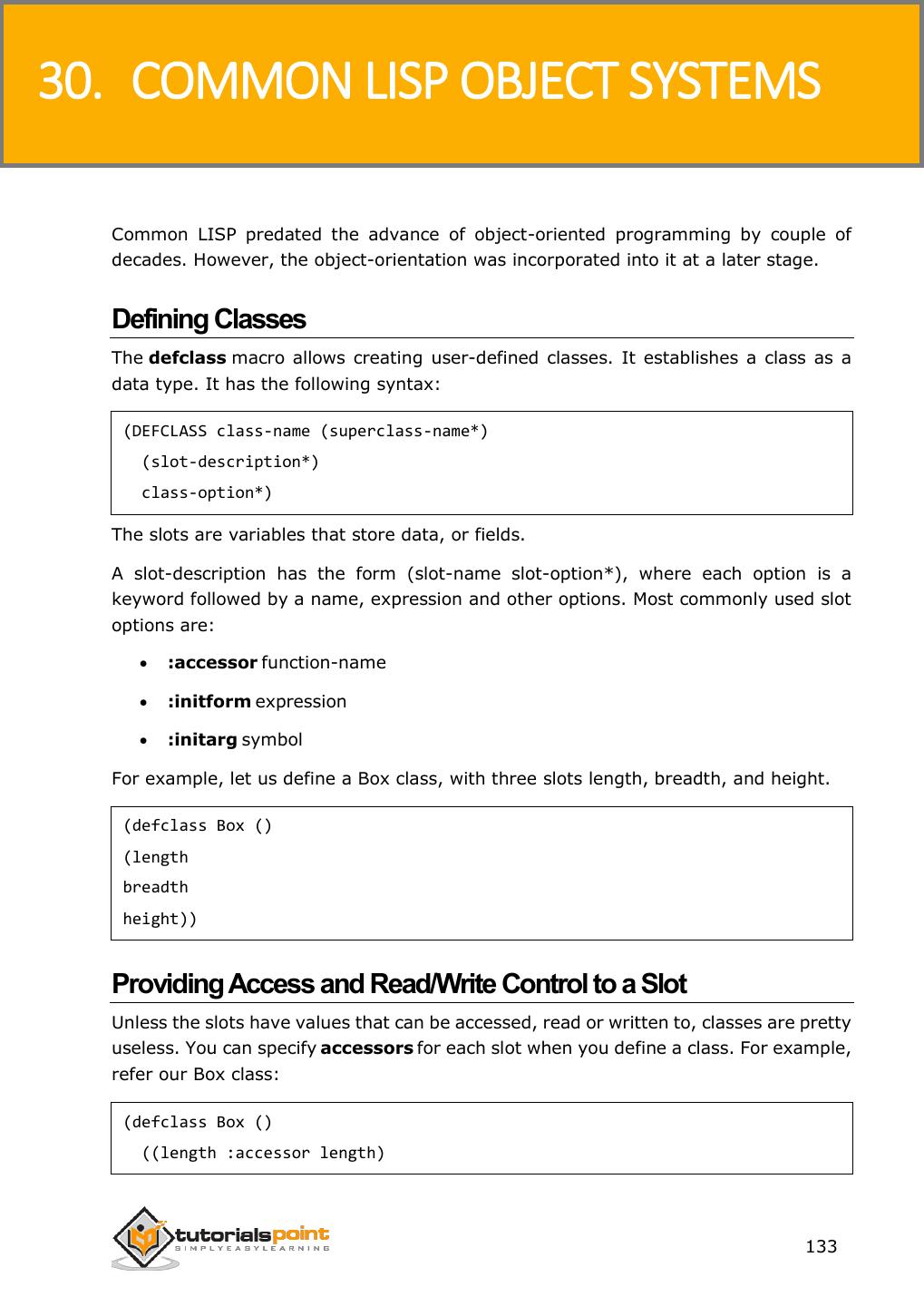 2 .About the Tutorial LISP is the second-oldest high-level programming language after Fortran and has changed a great deal since its early days, and a number of dialects have existed over its history. Today, the most widely known general-purpose LISP dialects are Common LISP and Scheme. This tutorial takes you through features of LISP Programming language by simple and practical approach of learning. Audience This reference has been prepared for the beginners to help them understand the basic to advanced concepts related to LISP Programming language. Prerequisites Before you start doing practice with various types of examples given in this reference, we assume that you are already aware of the fundamentals of computer programming and programming languages. Copyright & Disclaimer Copyright 2014 by Tutorials Point (I) Pvt. Ltd. All the content and graphics published in this e-book are the property of Tutotorials Point (I) Pvt. Ltd. The user of this e-book is prohibited to reuse, retain, copy, distribute or republish any contents or a part of contents of this e-book in any manner without written consent of the publisher. You strive to update the contents of our website and tutorials as timely and as precisely as possible, however, the contents may contain inaccuracies or errors. Tutorials Point (I) Pvt. Ltd. provides no guarantee regarding the accuracy, timeliness or completeness of our website or its contents including this tutorial. If you discover any errors on our website or in this tutorial, please notify us at contact@tutorialspoint.com i