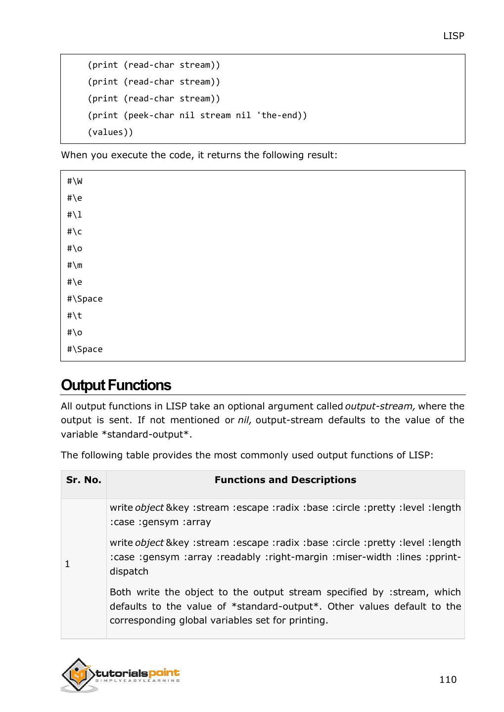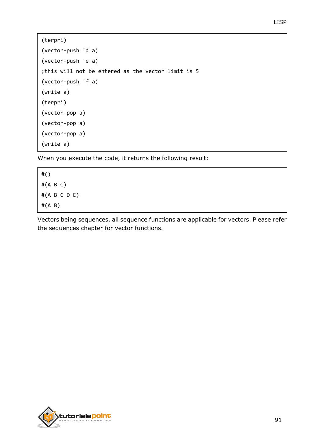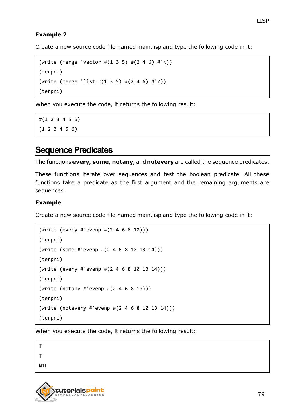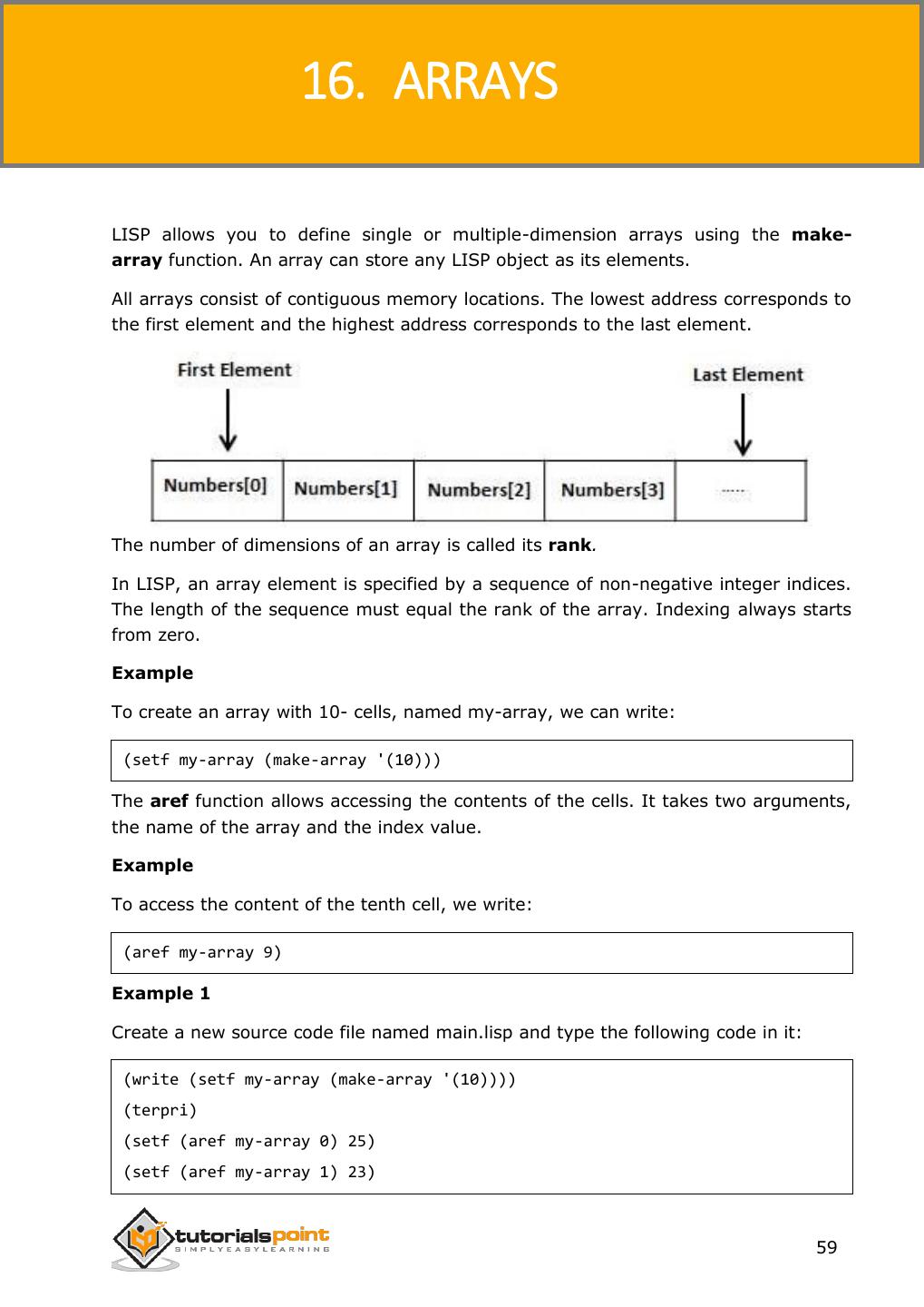 2 .About the Tutorial LISP is the second-oldest high-level programming language after Fortran and has changed a great deal since its early days, and a number of dialects have existed over its history. Today, the most widely known general-purpose LISP dialects are Common LISP and Scheme. This tutorial takes you through features of LISP Programming language by simple and practical approach of learning. Audience This reference has been prepared for the beginners to help them understand the basic to advanced concepts related to LISP Programming language. Prerequisites Before you start doing practice with various types of examples given in this reference, we assume that you are already aware of the fundamentals of computer programming and programming languages. Copyright & Disclaimer Copyright 2014 by Tutorials Point (I) Pvt. Ltd. All the content and graphics published in this e-book are the property of Tutotorials Point (I) Pvt. Ltd. The user of this e-book is prohibited to reuse, retain, copy, distribute or republish any contents or a part of contents of this e-book in any manner without written consent of the publisher. You strive to update the contents of our website and tutorials as timely and as precisely as possible, however, the contents may contain inaccuracies or errors. Tutorials Point (I) Pvt. Ltd. provides no guarantee regarding the accuracy, timeliness or completeness of our website or its contents including this tutorial. If you discover any errors on our website or in this tutorial, please notify us at contact@tutorialspoint.com i