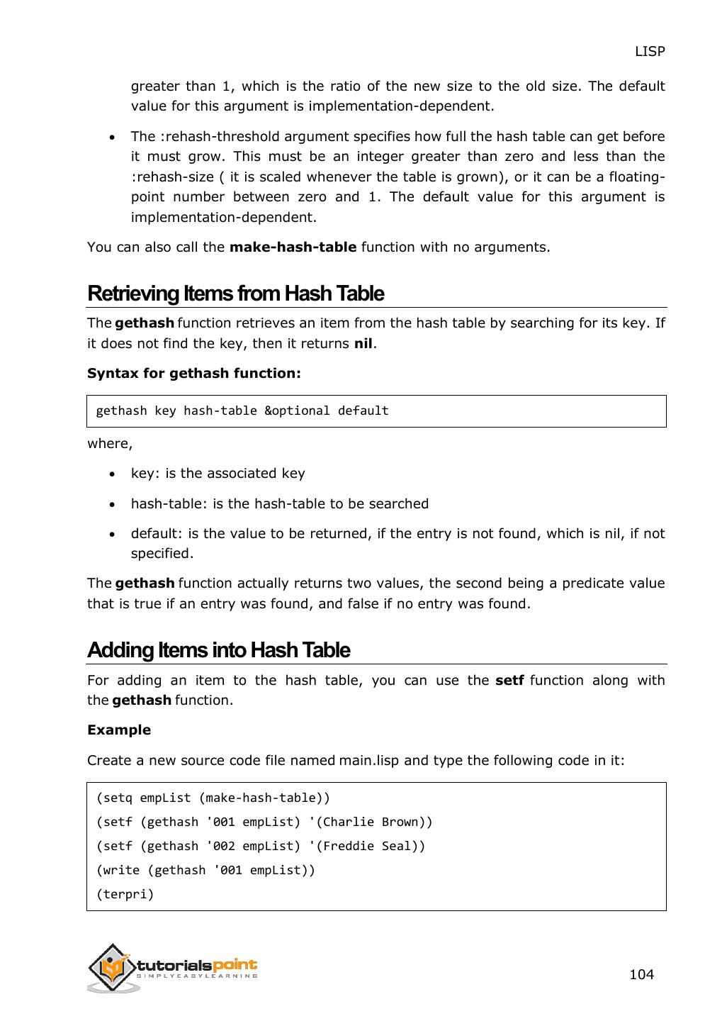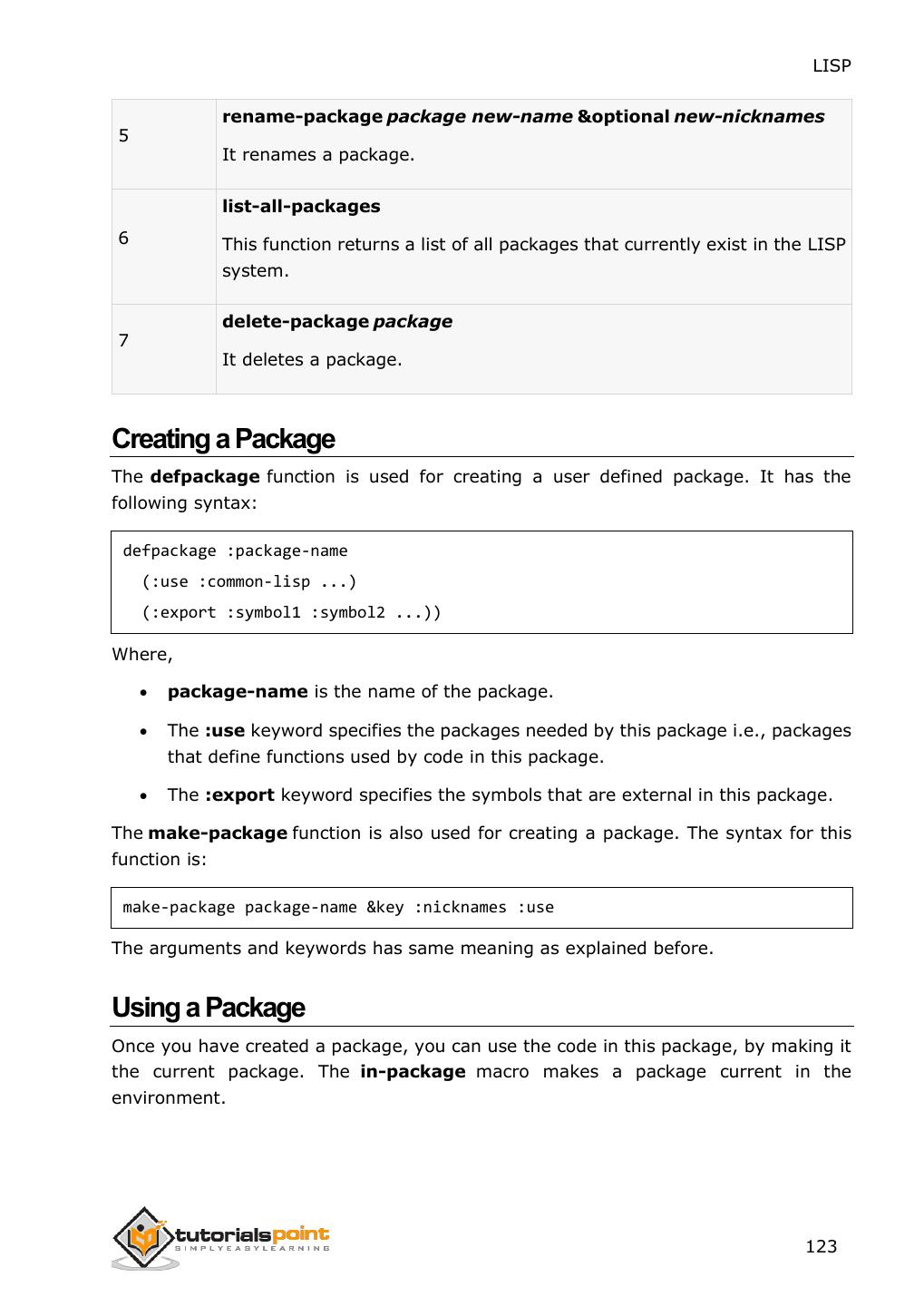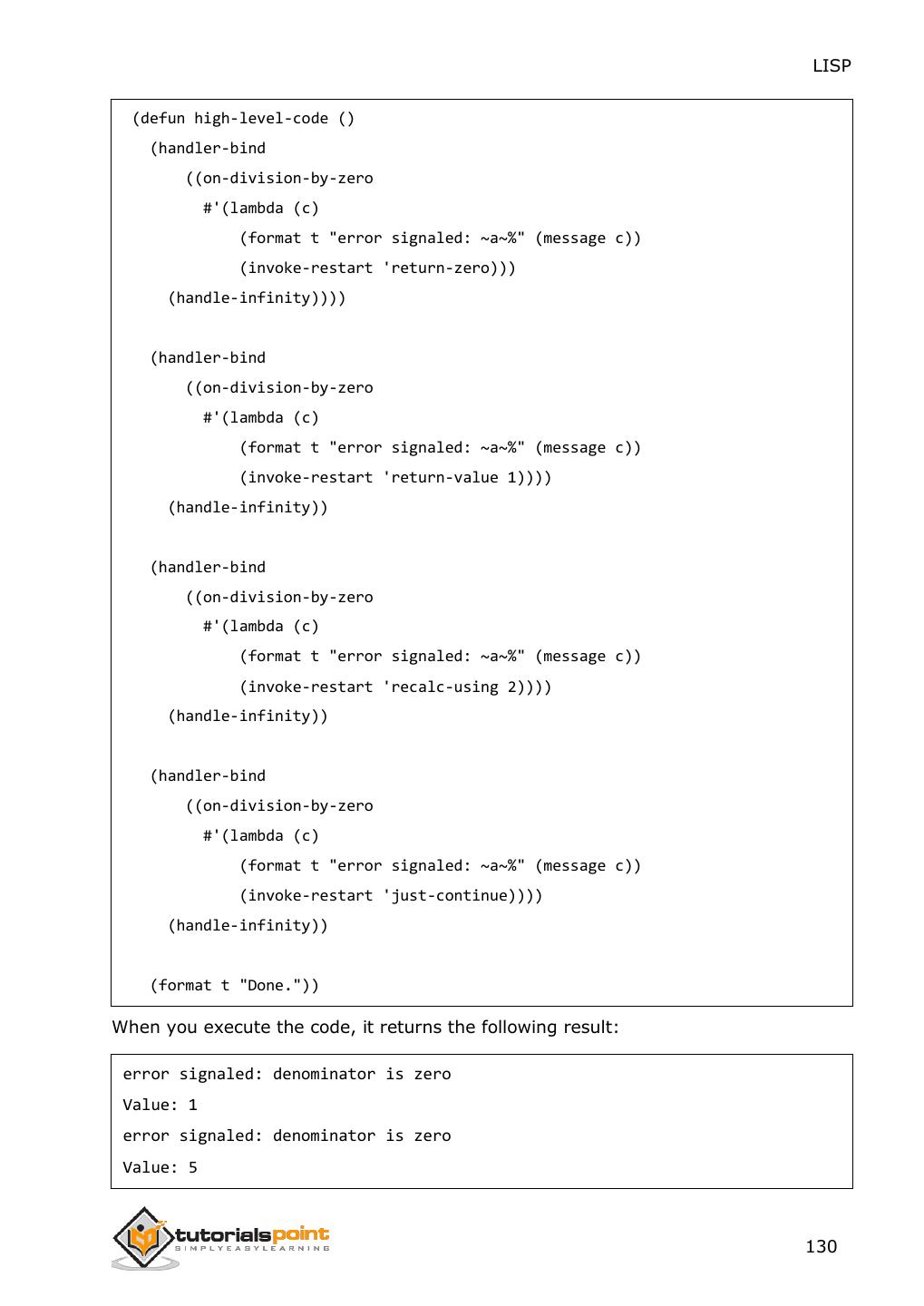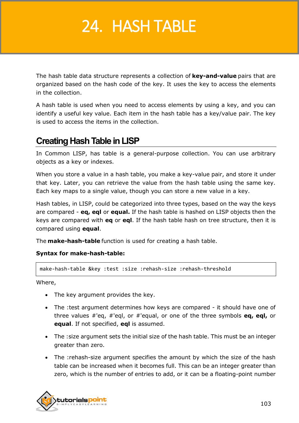 2 .About the Tutorial LISP is the second-oldest high-level programming language after Fortran and has changed a great deal since its early days, and a number of dialects have existed over its history. Today, the most widely known general-purpose LISP dialects are Common LISP and Scheme. This tutorial takes you through features of LISP Programming language by simple and practical approach of learning. Audience This reference has been prepared for the beginners to help them understand the basic to advanced concepts related to LISP Programming language. Prerequisites Before you start doing practice with various types of examples given in this reference, we assume that you are already aware of the fundamentals of computer programming and programming languages. Copyright & Disclaimer Copyright 2014 by Tutorials Point (I) Pvt. Ltd. All the content and graphics published in this e-book are the property of Tutotorials Point (I) Pvt. Ltd. The user of this e-book is prohibited to reuse, retain, copy, distribute or republish any contents or a part of contents of this e-book in any manner without written consent of the publisher. You strive to update the contents of our website and tutorials as timely and as precisely as possible, however, the contents may contain inaccuracies or errors. Tutorials Point (I) Pvt. Ltd. provides no guarantee regarding the accuracy, timeliness or completeness of our website or its contents including this tutorial. If you discover any errors on our website or in this tutorial, please notify us at contact@tutorialspoint.com i