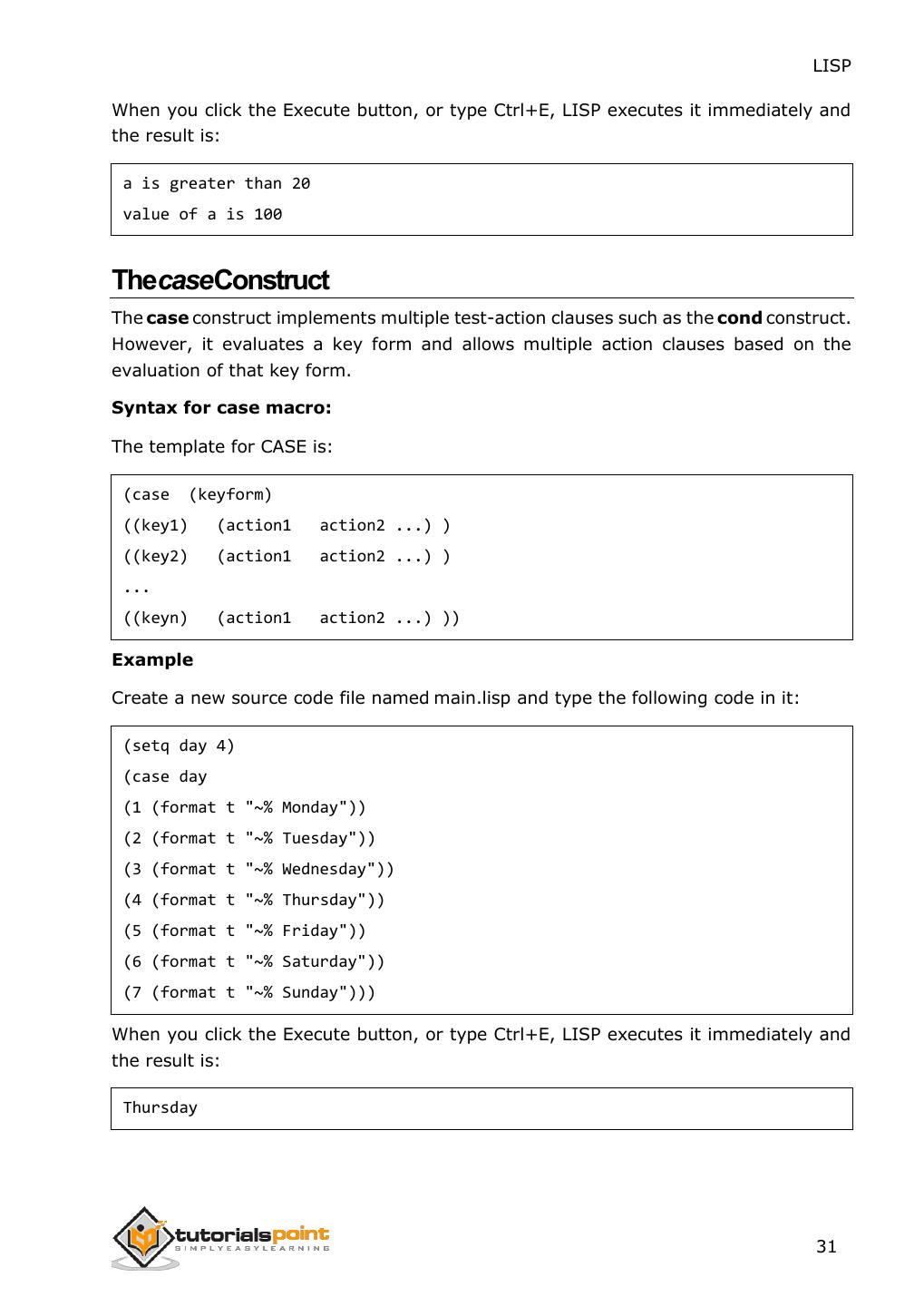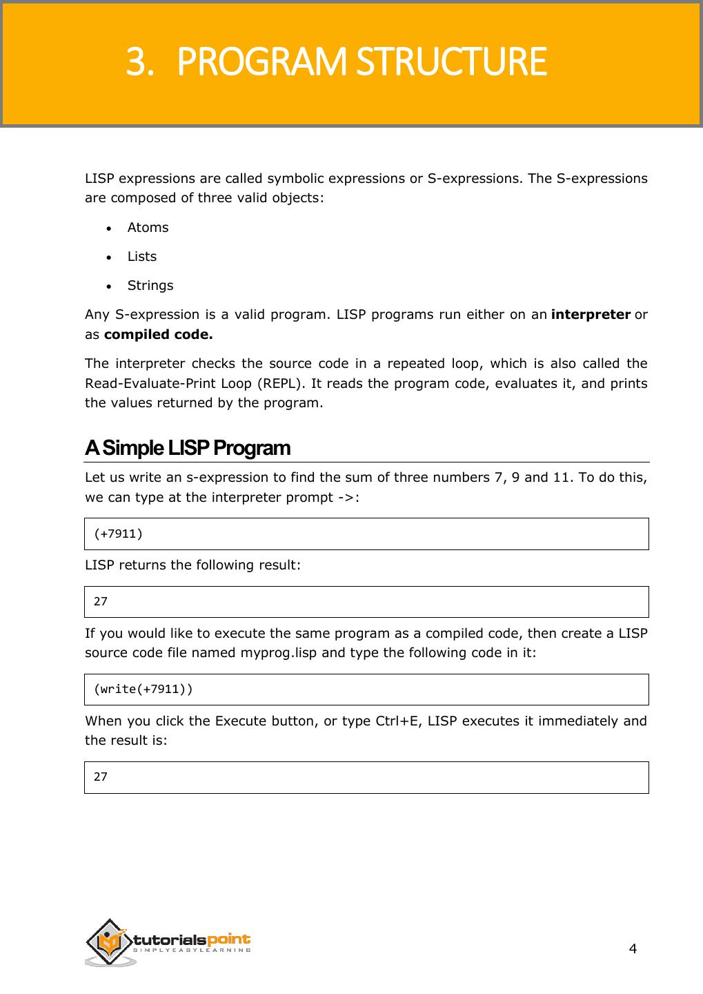 12 . LISP 3. PROGRAM STRUCTURE LISP expressions are called symbolic expressions or S-expressions. The S-expressions are composed of three valid objects: Atoms Lists Strings Any S-expression is a valid program. LISP programs run either on an interpreter or as compiled code. The interpreter checks the source code in a repeated loop, which is also called the Read-Evaluate-Print Loop (REPL). It reads the program code, evaluates it, and prints the values returned by the program. A Simple LISP Program Let us write an s-expression to find the sum of three numbers 7, 9 and 11. To do this, we can type at the interpreter prompt ->: (+7911) LISP returns the following result: 27 If you would like to execute the same program as a compiled code, then create a LISP source code file named myprog.lisp and type the following code in it: (write(+7911)) When you click the Execute button, or type Ctrl+E, LISP executes it immediately and the result is: 27 4