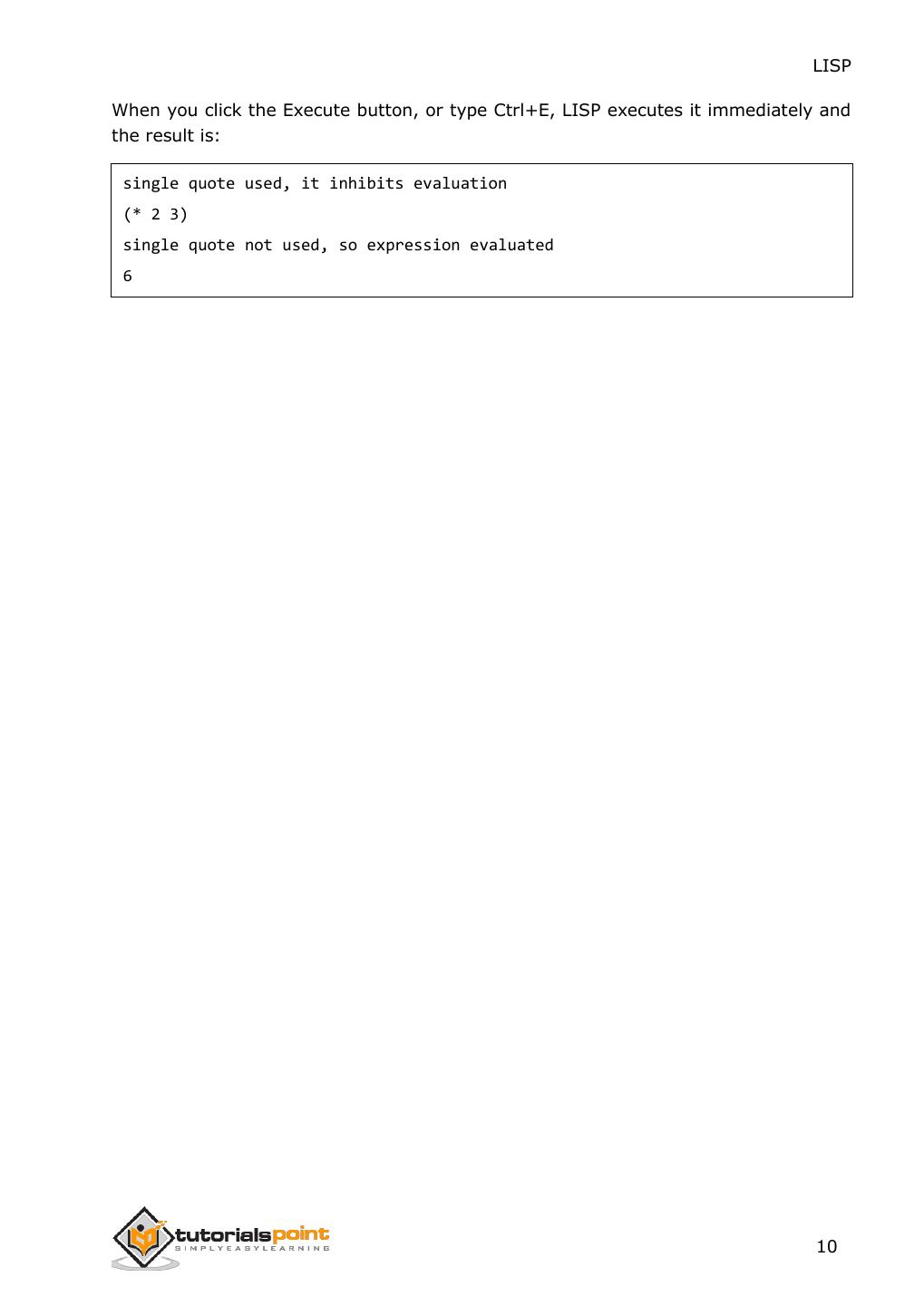 18 . LISP When you click the Execute button, or type Ctrl+E, LISP executes it immediately and the result is: single quote used, it inhibits evaluation (* 2 3) single quote not used, so expression evaluated 6 10