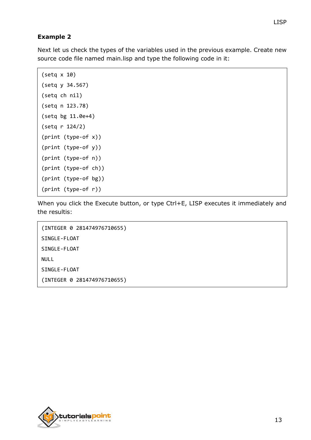 21 . LISP Example 2 Next let us check the types of the variables used in the previous example. Create new source code file named main.lisp and type the following code in it: (setq x 10) (setq y 34.567) (setq ch nil) (setq n 123.78) (setq bg 11.0e+4) (setq r 124/2) (print (type-of x)) (print (type-of y)) (print (type-of n)) (print (type-of ch)) (print (type-of bg)) (print (type-of r)) When you click the Execute button, or type Ctrl+E, LISP executes it immediately and the resultis: (INTEGER 0 281474976710655) SINGLE-FLOAT SINGLE-FLOAT NULL SINGLE-FLOAT (INTEGER 0 281474976710655) 13