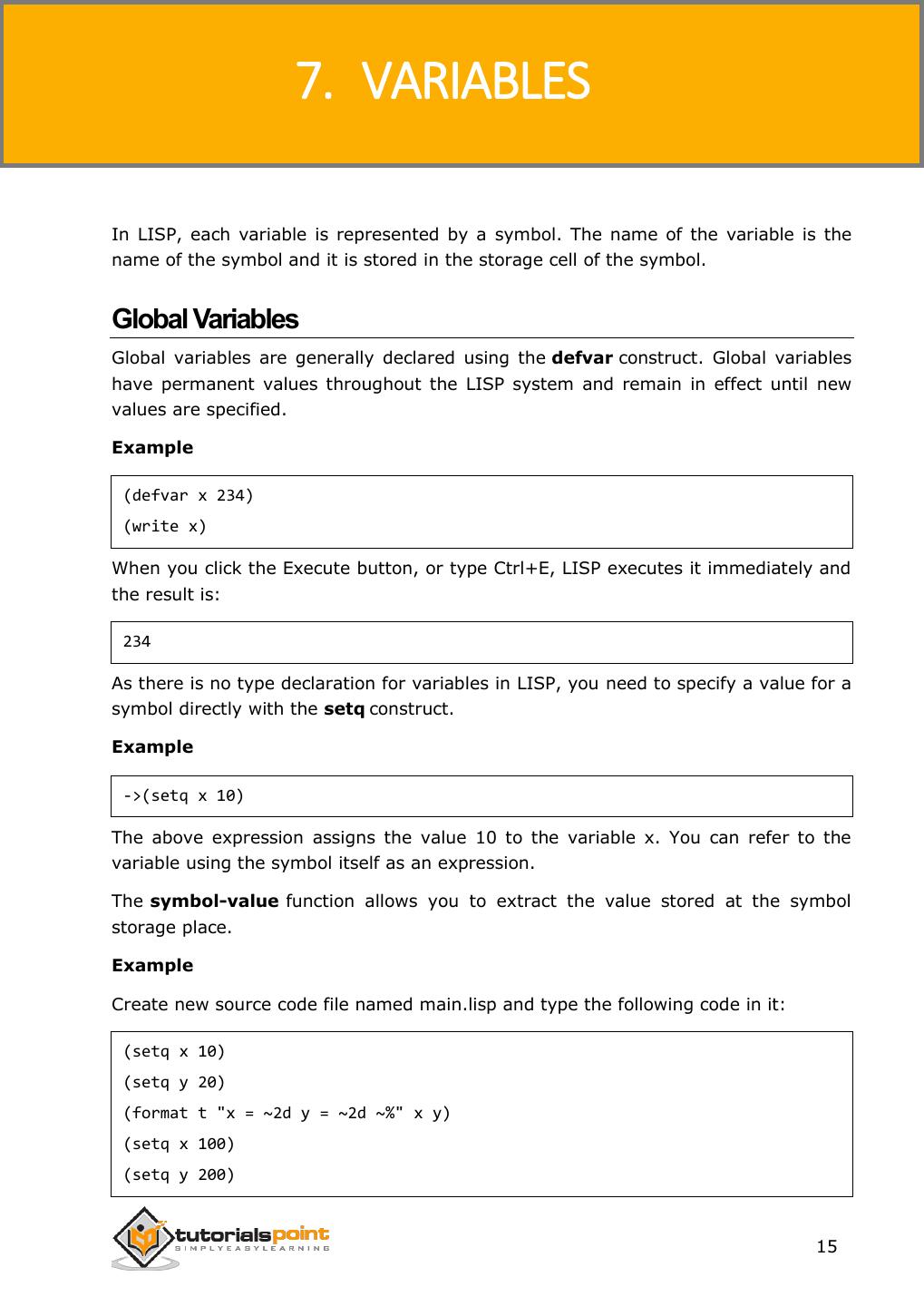 23 . LISP 7. VARIABLES In LISP, each variable is represented by a symbol. The name of the variable is the name of the symbol and it is stored in the storage cell of the symbol. Global Variables Global variables are generally declared using the defvar construct. Global variables have permanent values throughout the LISP system and remain in effect until new values are specified. Example (defvar x 234) (write x) When you click the Execute button, or type Ctrl+E, LISP executes it immediately and the result is: 234 As there is no type declaration for variables in LISP, you need to specify a value for a symbol directly with the setq construct. Example ->(setq x 10) The above expression assigns the value 10 to the variable x. You can refer to the variable using the symbol itself as an expression. The symbol-value function allows you to extract the value stored at the symbol storage place. Example Create new source code file named main.lisp and type the following code in it: (setq x 10) (setq y 20) (format t "x = ~2d y = ~2d ~%" x y) (setq x 100) (setq y 200) 15