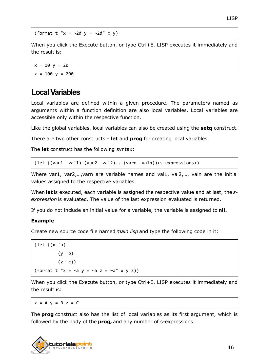 24 . LISP (format t "x = ~2d y = ~2d" x y) When you click the Execute button, or type Ctrl+E, LISP executes it immediately and the result is: x = 10 y = 20 x = 100 y = 200 Local Variables Local variables are defined within a given procedure. The parameters named as arguments within a function definition are also local variables. Local variables are accessible only within the respective function. Like the global variables, local variables can also be created using the setq construct. There are two other constructs - let and prog for creating local variables. The let construct has the following syntax: (let ((var1 val1) (var2 val2).. (varn valn))<s-expressions>) Where var1, var2,…,varn are variable names and val1, val2,…, valn are the initial values assigned to the respective variables. When let is executed, each variable is assigned the respective value and at last, the s- expression is evaluated. The value of the last expression evaluated is returned. If you do not include an initial value for a variable, the variable is assigned to nil. Example Create new source code file named main.lisp and type the following code in it: (let ((x 'a) (y 'b) (z 'c)) (format t "x = ~a y = ~a z = ~a" x y z)) When you click the Execute button, or type Ctrl+E, LISP executes it immediately and the result is: x = A y = B z = C The prog construct also has the list of local variables as its first argument, which is followed by the body of the prog, and any number of s-expressions. 16