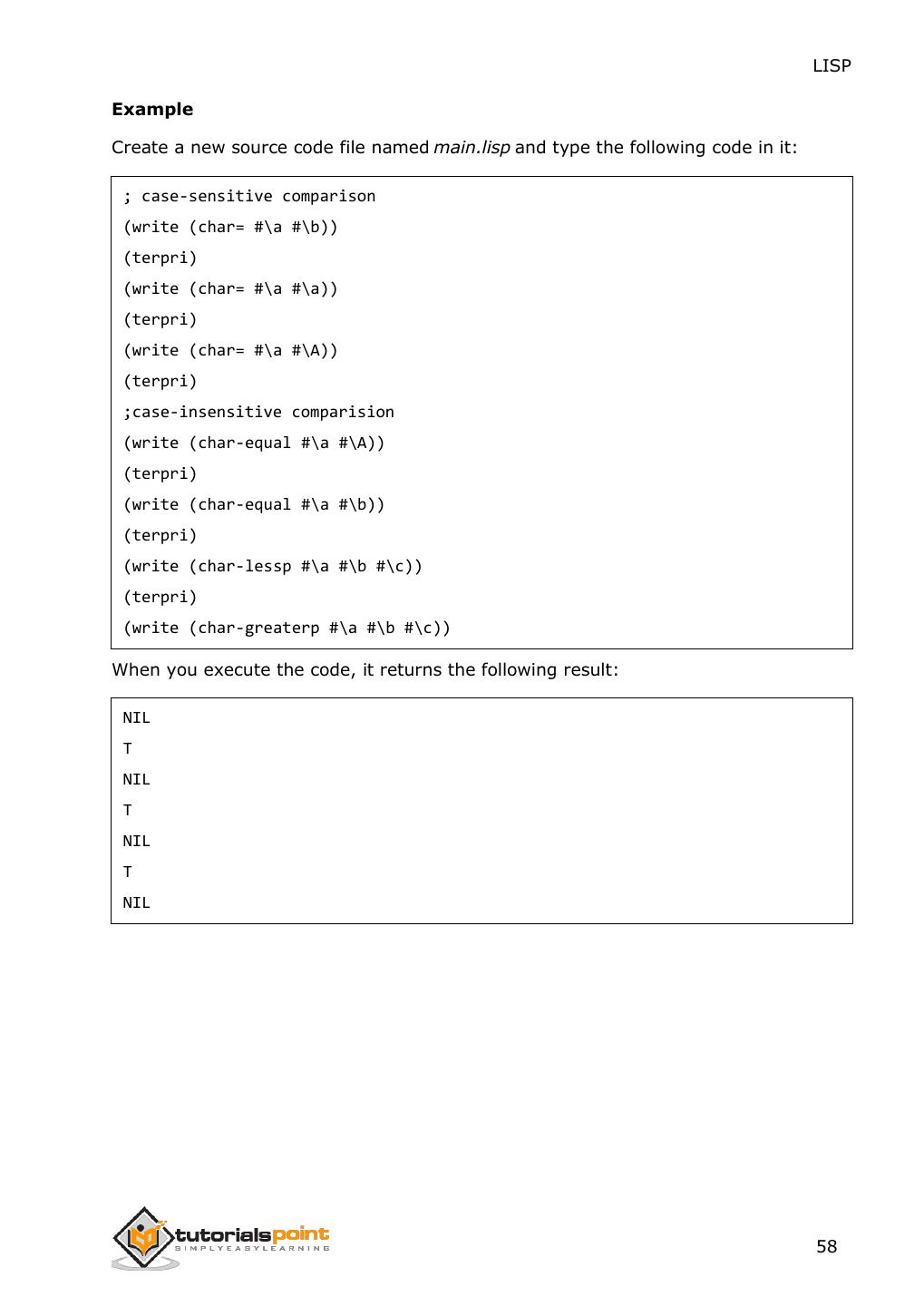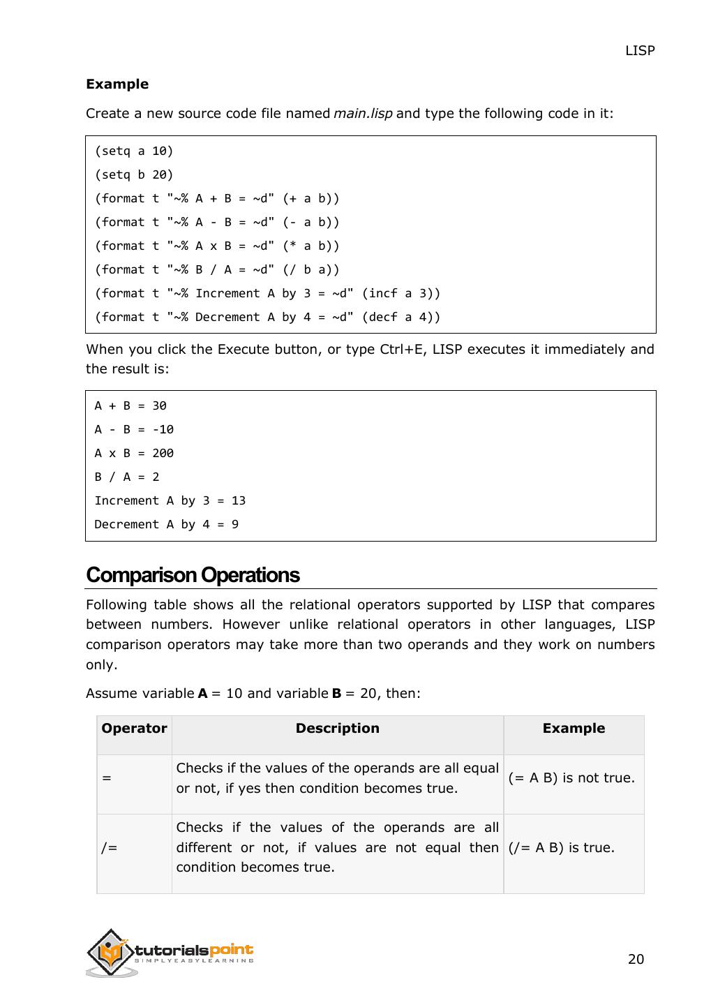 28 . LISP Example Create a new source code file named main.lisp and type the following code in it: (setq a 10) (setq b 20) (format t "~% A + B = ~d" (+ a b)) (format t "~% A - B = ~d" (- a b)) (format t "~% A x B = ~d" (* a b)) (format t "~% B / A = ~d" (/ b a)) (format t "~% Increment A by 3 = ~d" (incf a 3)) (format t "~% Decrement A by 4 = ~d" (decf a 4)) When you click the Execute button, or type Ctrl+E, LISP executes it immediately and the result is: A + B = 30 A - B = -10 A x B = 200 B / A = 2 Increment A by 3 = 13 Decrement A by 4 = 9 Comparison Operations Following table shows all the relational operators supported by LISP that compares between numbers. However unlike relational operators in other languages, LISP comparison operators may take more than two operands and they work on numbers only. Assume variable A = 10 and variable B = 20, then: Operator Description Example Checks if the values of the operands are all equal = (= A B) is not true. or not, if yes then condition becomes true. Checks if the values of the operands are all /= different or not, if values are not equal then (/= A B) is true. condition becomes true. 20
