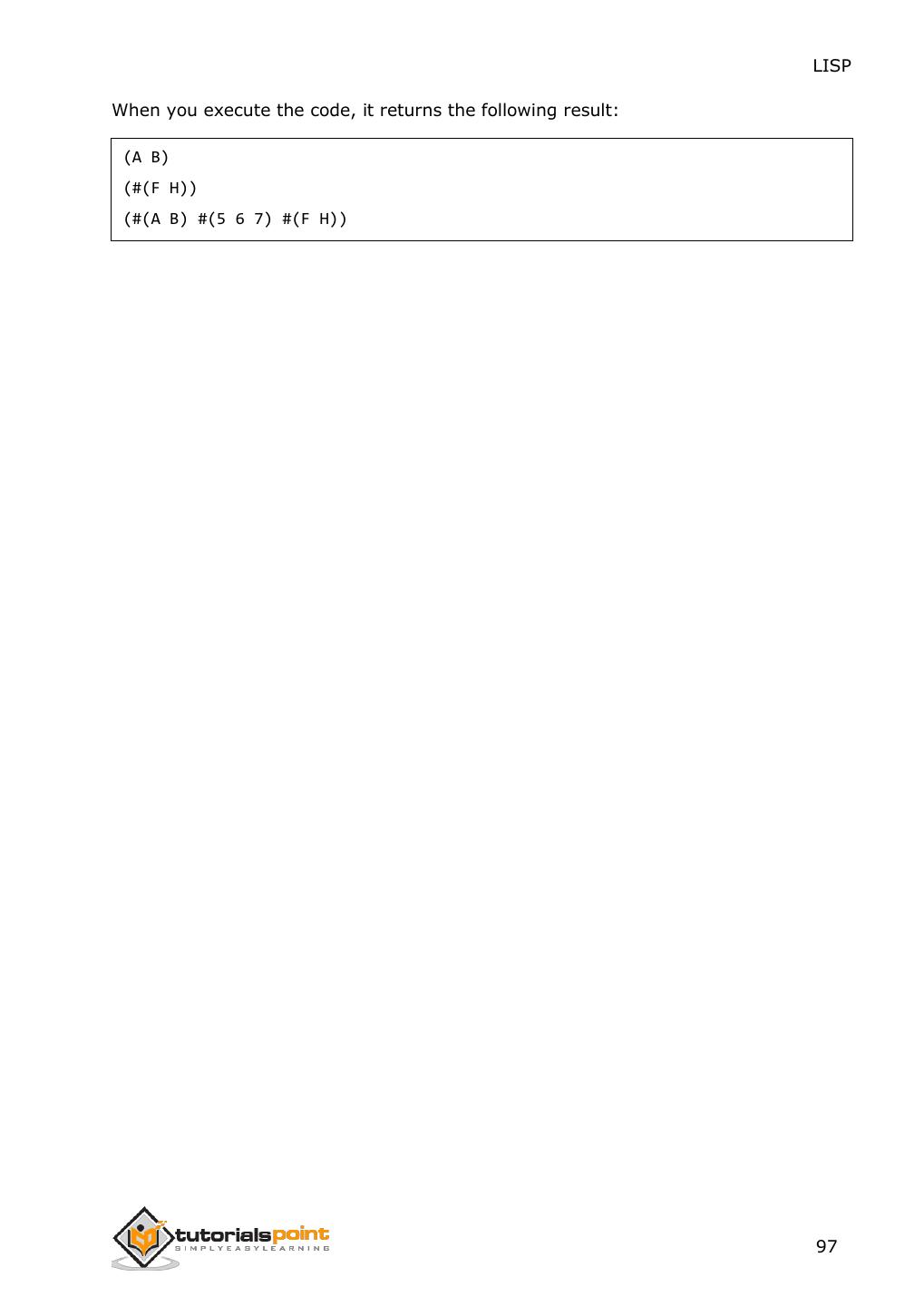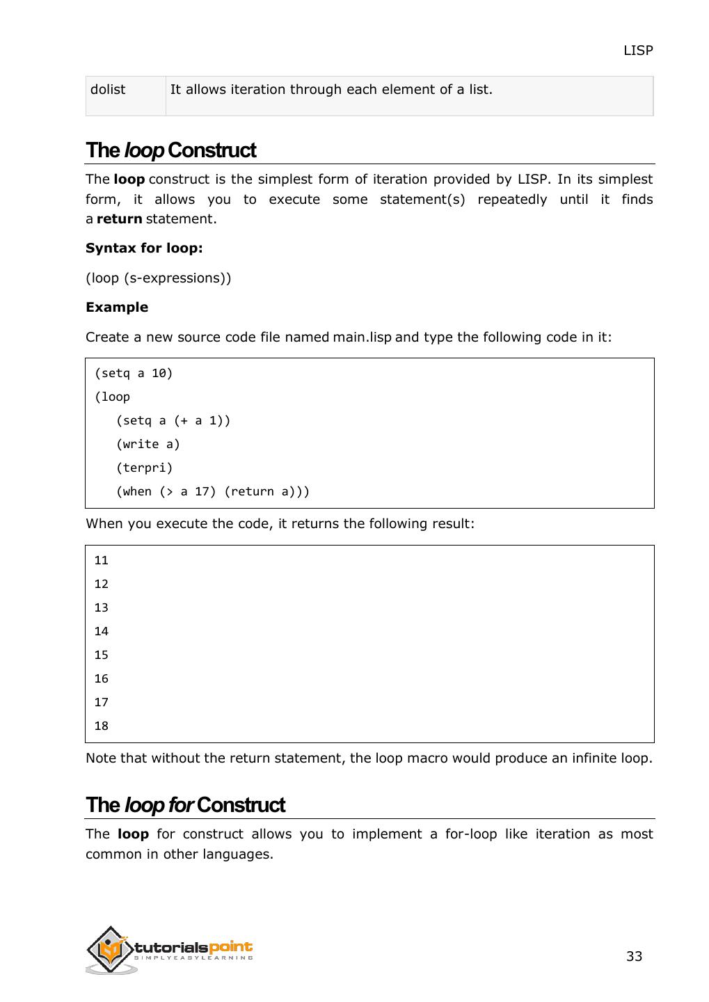 25 . LISP The prog function executes the list of s-expressions in sequence and returns nil unless it encounters a function call named return. Then the argument of the return function is evaluated and returned. Example Create new source code file named main.lisp and type the following code in it: (prog ((x '(a b c)) (y '(1 2 3)) (z '(p q 10))) (format t "x = ~a y = ~a z = ~a" x y z)) When you click the Execute button, or type Ctrl+E, LISP executes it immediately and the result is: x = (A B C) y = (1 2 3) z = (P Q 10) 17