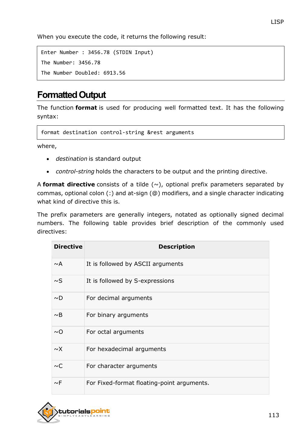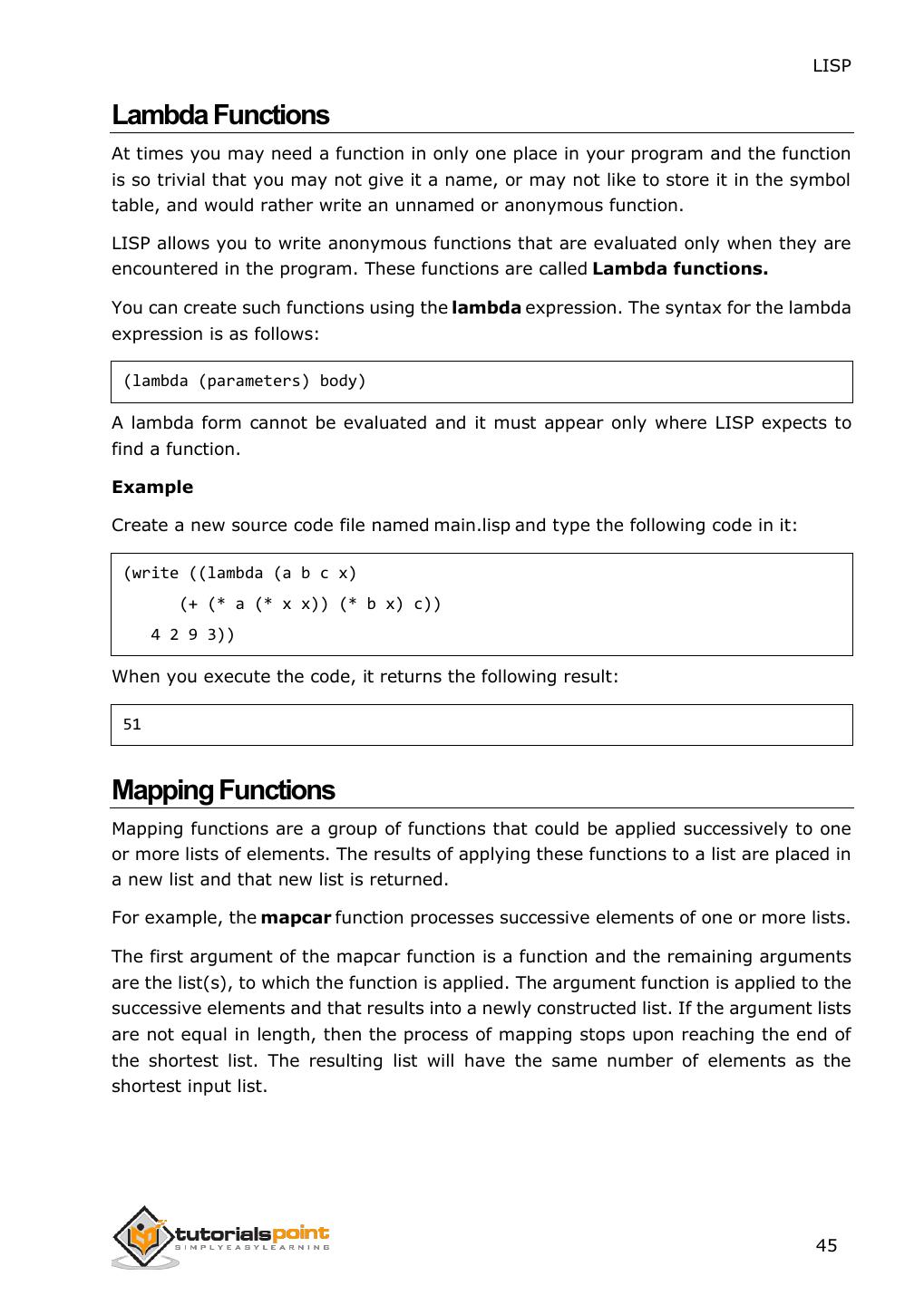 17 . LISP The evaluator defines syntax of LISP forms that are built from s-expressions. This second level of evaluation defines a syntax that determines which s- expressions are LISP forms. A LISP form can be: An atom An empty list or non-list Any list that has a symbol as its first element The evaluator works as a function that takes a valid LISP form as an argument and returns a value. This is the reason why we put the LISP expression in parenthesis, because we are sending the entire expression/form to the evaluator as argument. Naming Conventions in LISP Name or symbols can consist of any number of alphanumeric characters other than whitespace, open and closing parentheses, double and single quotes, backslash, comma, colon, semicolon and vertical bar. To use these characters in a name, you need to use escape character (\). A name can have digits but must not be made of only digits, because then it would be read as a number. Similarly a name can have periods, but cannot be entirely made of periods. Use of Single Quotation Mark LISP evaluates everything including the function arguments and list members. At times, we need to take atoms or lists literally and do not want them evaluated or treated as function calls. To do this, we need to precede the atom or the list with a single quotation mark. The following example demonstrates this: Create a file named main.lisp and type the following code into it: (write-line "single quote used, it inhibits evaluation") (write '(* 2 3)) (write-line " ") (write-line "single quote not used, so expression evaluated") (write (* 2 3)) 9