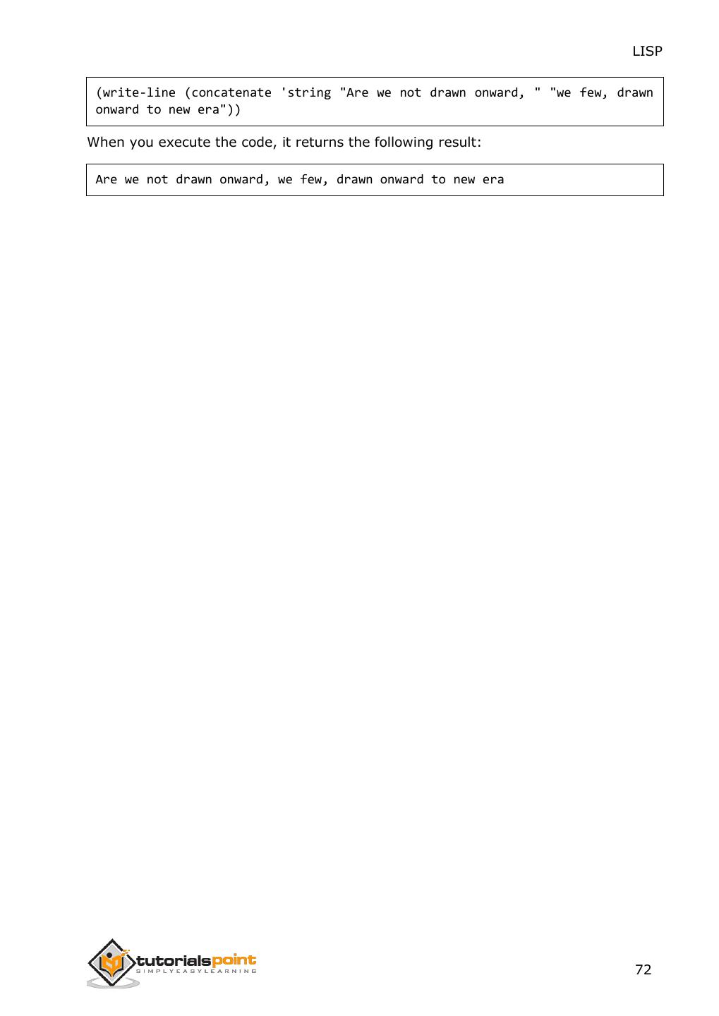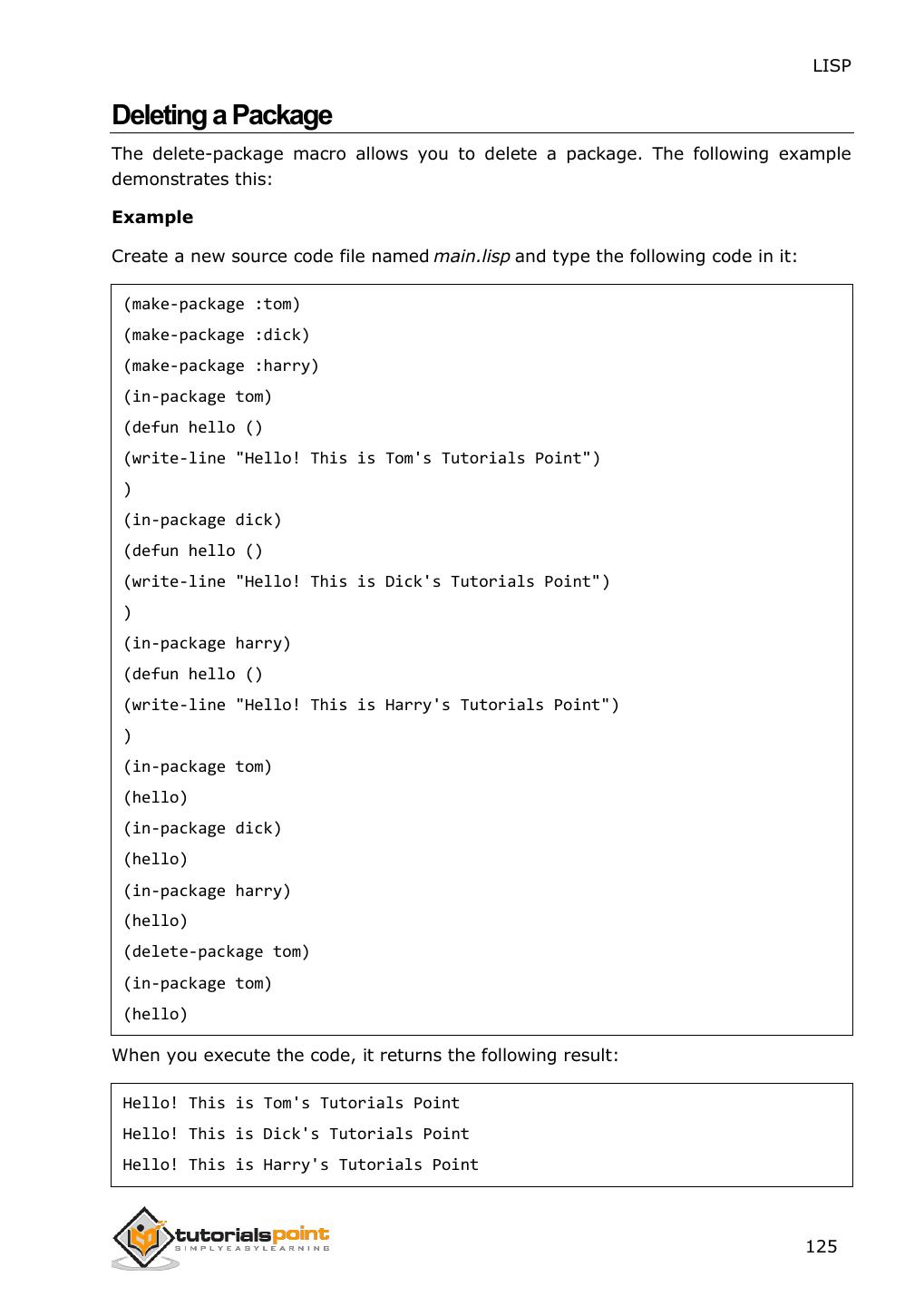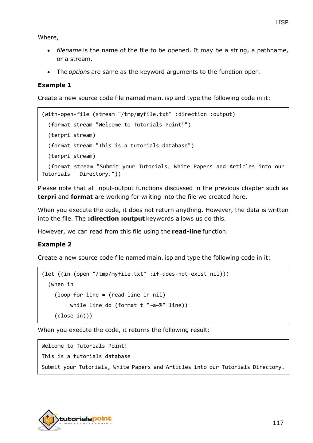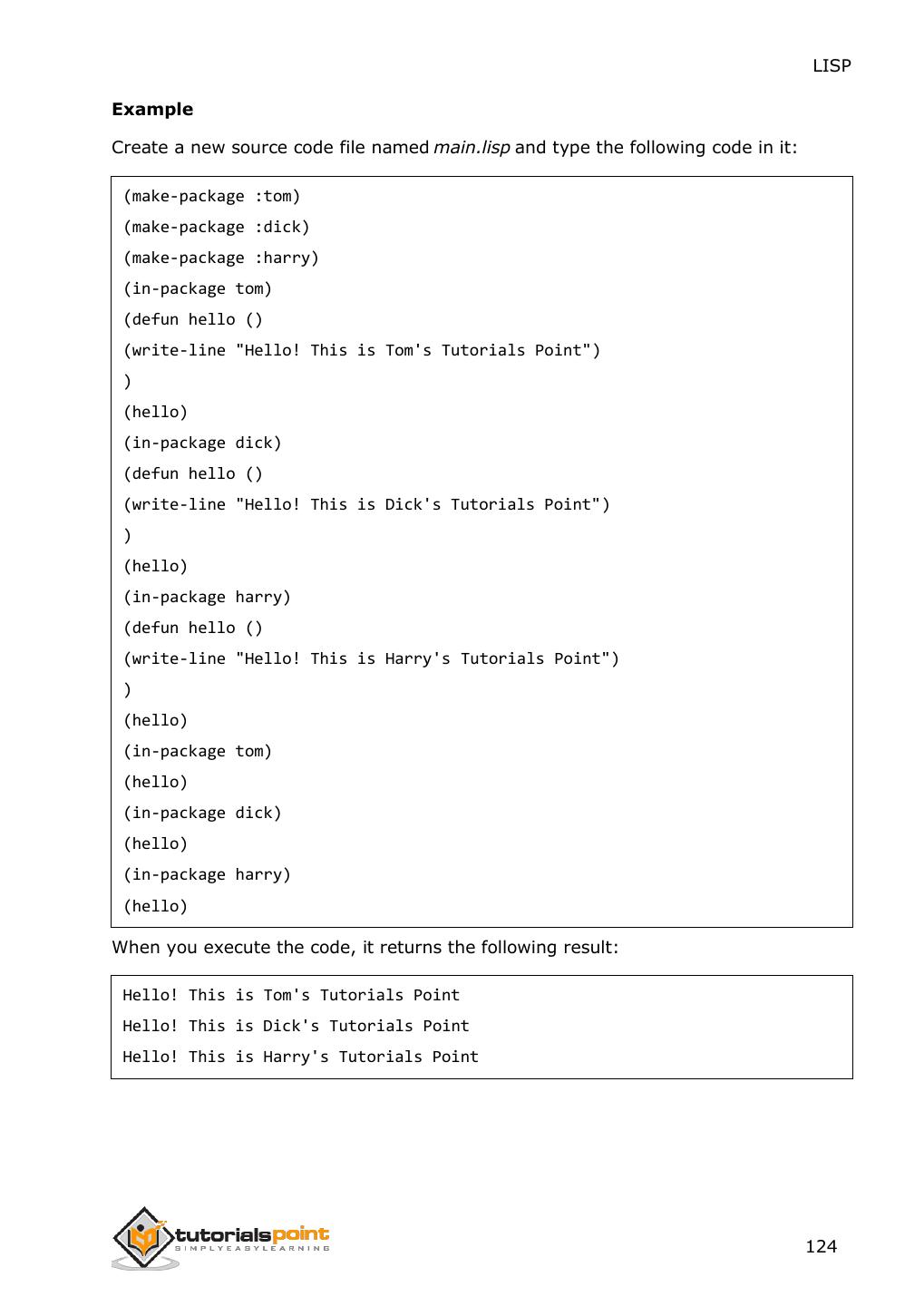 14 . LISP This second level of evaluation defines a syntax that determines which s- expressions are LISP forms. The evaluator works as a function that takes a valid LISP form as an argument and returns a value. This is the reason why we put the LISP expression in parenthesis, because we are sending the entire expression/form to the evaluator as argument. The 'Hello World' Program Learning a new programming language does not really take off until you learn how to greet the entire world in that language, right ? Let us create new source code file named main.lisp and type the following code in it: (write-line "Hello World") (write-line "I am at 'Tutorials Point'! Learning LISP") When you click the Execute button, or type Ctrl+E, LISP executes it immediately and the result is: Hello World I am at 'Tutorials Point'! Learning LISP 6