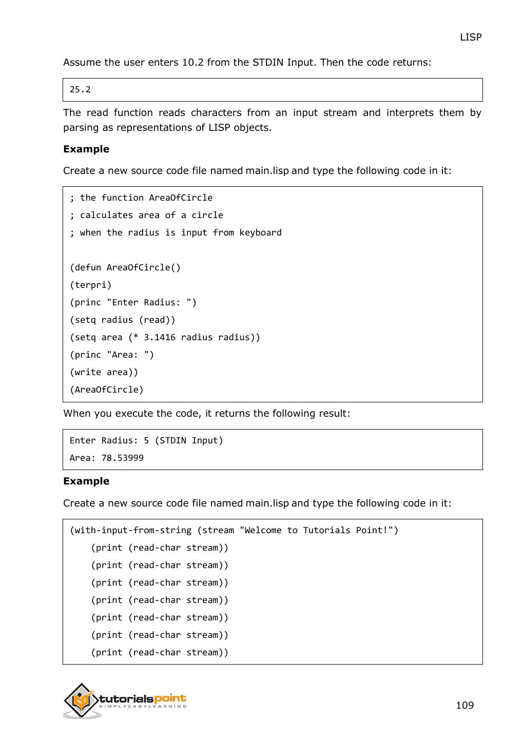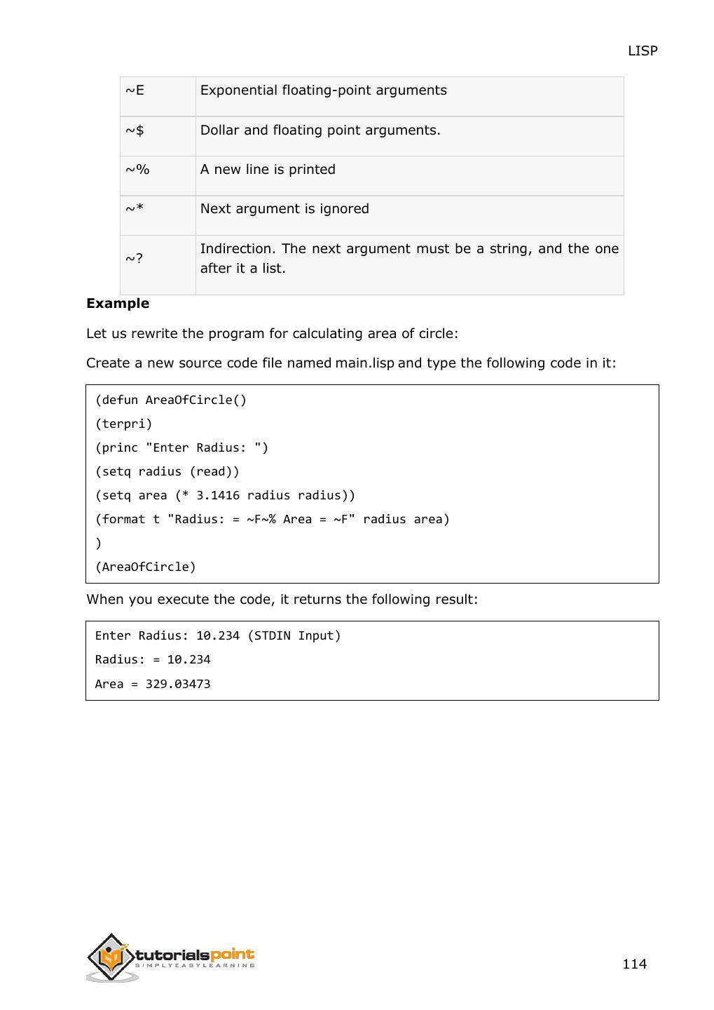 26 . LISP 8. CONSTANTS In LISP, constants are variables that never change their values during program execution. Constants are declared using the defconstant construct. Example The following example shows declaring a global constant PI and later using this value inside a function named area-circle that calculates the area of a circle. The defun construct is used for defining a function, we will look into it in the 'Functions' chapter. Create a new source code file named main.lisp and type the following code in it: (defconstant PI 3.141592) (defun area-circle(rad) (terpri) (format t "Radius: ~5f" rad) (format t "~%Area: ~10f" (* PI rad rad))) (area-circle 10) When you click the Execute button, or type Ctrl+E, LISP executes it immediately and the result is: Radius: 10.0 Area: 314.1592 18