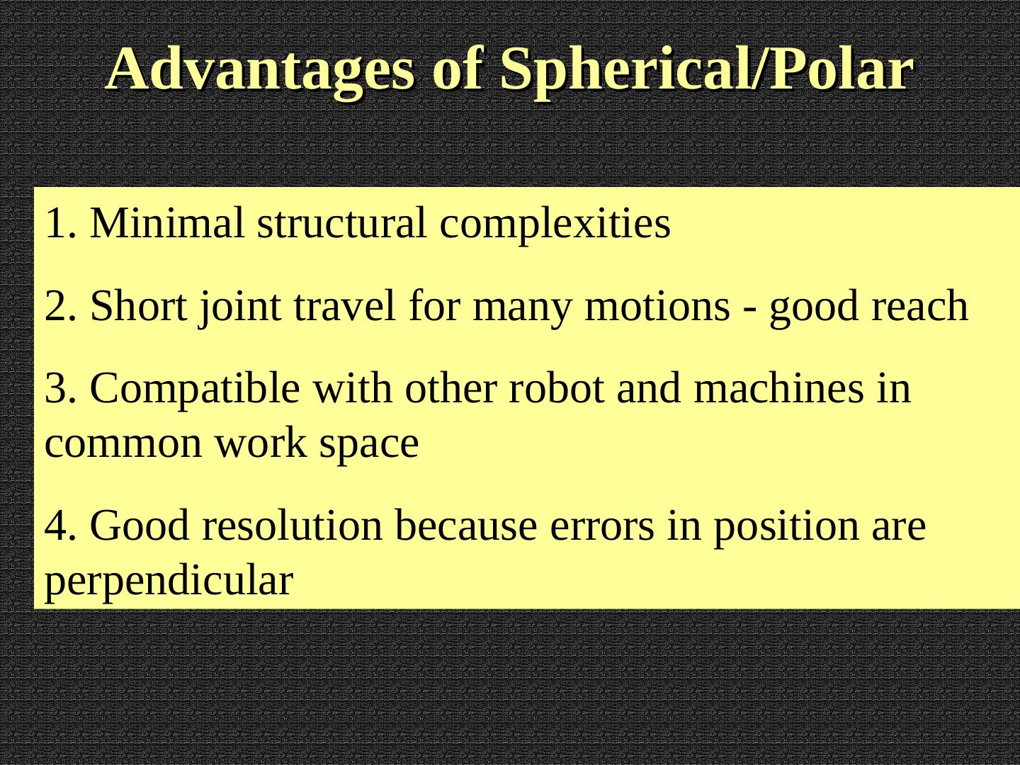 15 . Advantages of Spherical/Polar 1. Minimal structural complexities 2. Short joint travel for many motions - good reach 3. Compatible with other robot and machines in common work space 4. Good resolution because errors in position are perpendicular