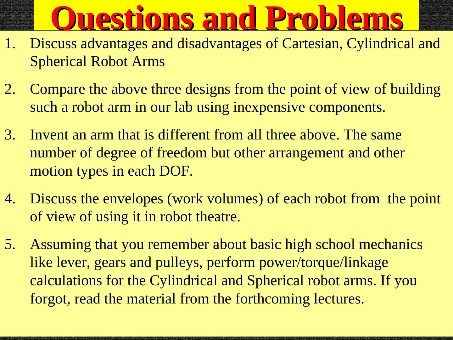 16 . Questions and Problems 1. Discuss advantages and disadvantages of Cartesian, Cylindrical and Spherical Robot Arms 2. Compare the above three designs from the point of view of building such a robot arm in our lab using inexpensive components. 3. Invent an arm that is different from all three above. The same number of degree of freedom but other arrangement and other motion types in each DOF. 4. Discuss the envelopes (work volumes) of each robot from the point of view of using it in robot theatre. 5. Assuming that you remember about basic high school mechanics like lever, gears and pulleys, perform power/torque/linkage calculations for the Cylindrical and Spherical robot arms. If you forgot, read the material from the forthcoming lectures.