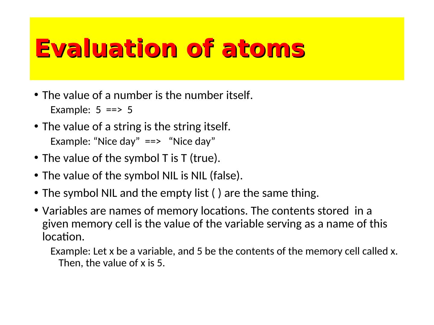 12 .Evaluation of atoms • The value of a number is the number itself. Example: 5 ==> 5 • The value of a string is the string itself. Example: “Nice day” ==> “Nice day” • The value of the symbol T is T (true). • The value of the symbol NIL is NIL (false). • The symbol NIL and the empty list ( ) are the same thing. • Variables are names of memory locations. The contents stored in a given memory cell is the value of the variable serving as a name of this location. Example: Let x be a variable, and 5 be the contents of the memory cell called x. Then, the value of x is 5.