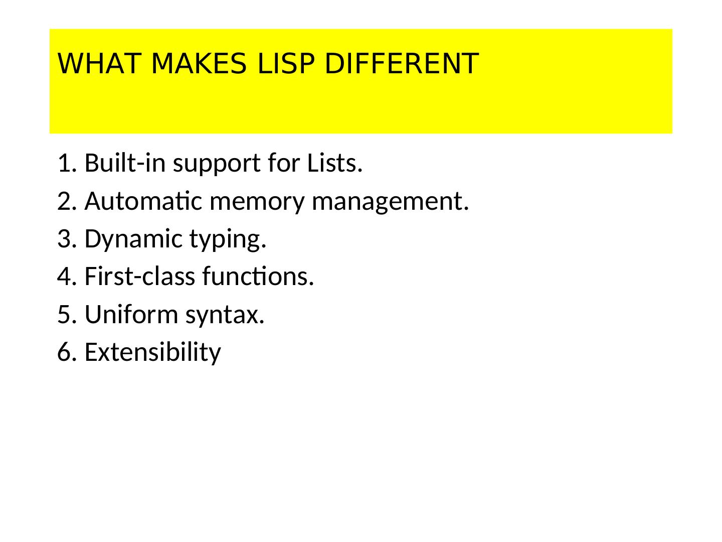 16 .WHAT MAKES LISP DIFFERENT 1. Built-in support for Lists. 2. Automatic memory management. 3. Dynamic typing. 4. First-class functions. 5. Uniform syntax. 6. Extensibility