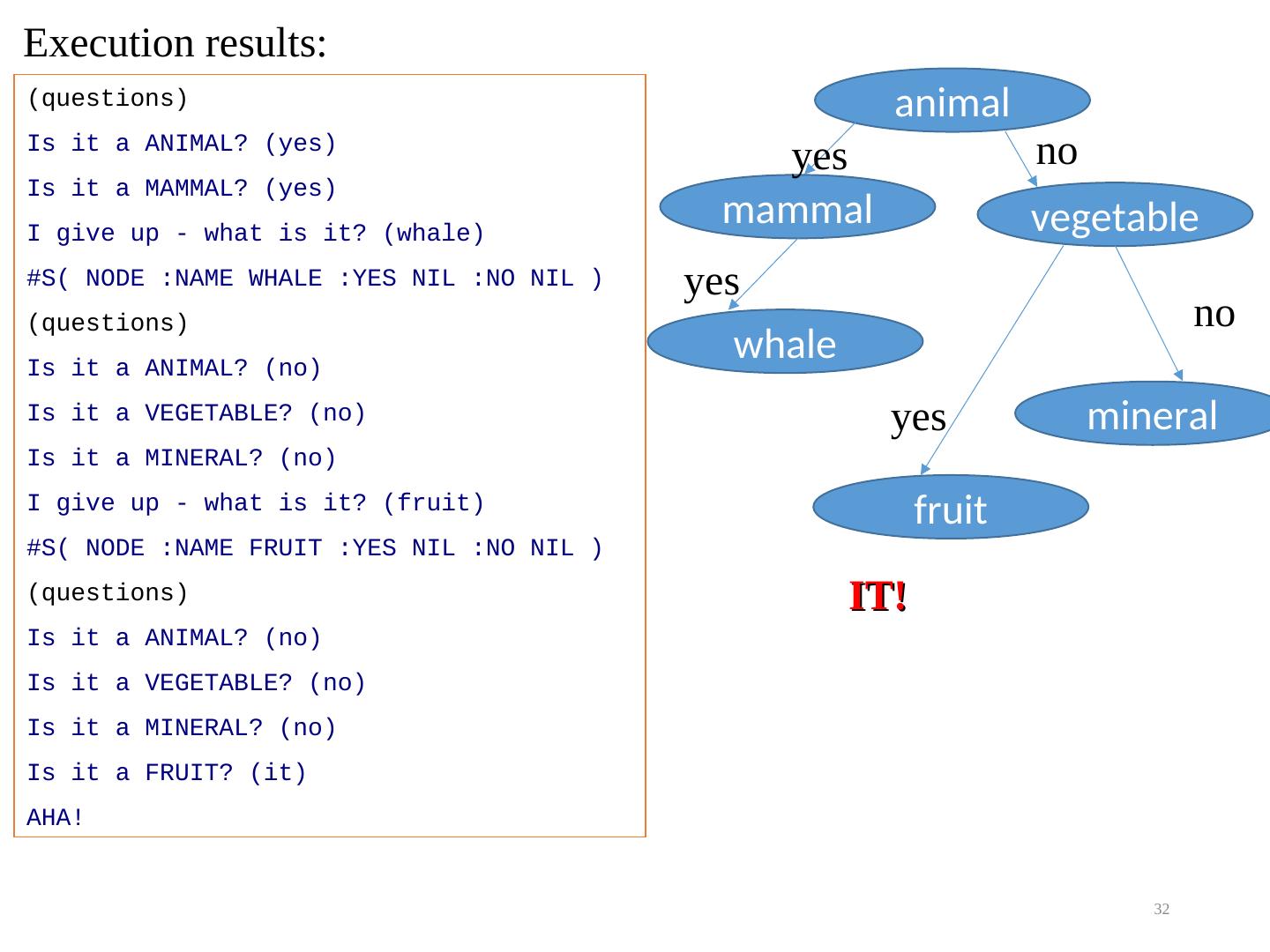 29 .Example of interaction with the program that will be shown: You type How it works? (questions) Is it a ANIMAL? (yes) Program responds You have some item in Is it a MAMMAL? (yes) mind, program asks, I give up - what is it? (whale) you respond. #S( NODE :NAME WHALE :YES NIL :NO NIL ) (questions) Program learned this. Is it a ANIMAL? (no) Now it knows Is it a VEGETABLE? (no) that whale is a mammal. Is it a MINERAL? (no) I give up - what is it? (fruit) #S( NODE :NAME FRUIT :YES NIL :NO NIL ) (questions) Is it a ANIMAL? (no) Is it a VEGETABLE? (no) You confirm that the program guessed correctly Is it a MINERAL? (no) (n Is it a FRUIT? (it) Program learned this. Now it knows that AHA! it is a fruit 29
