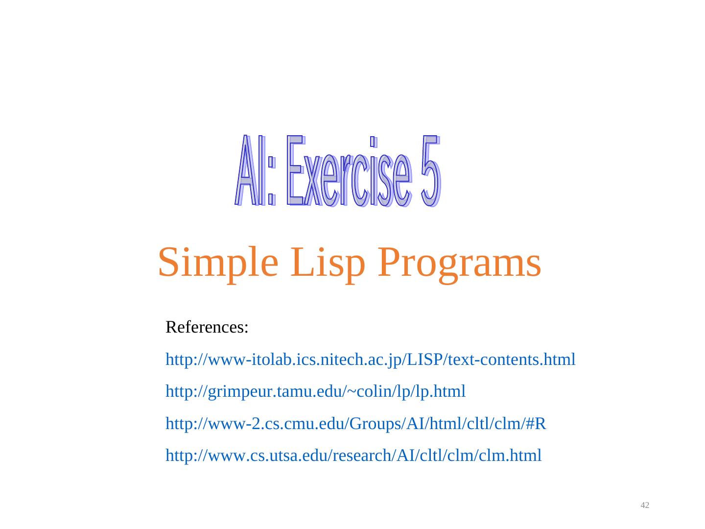 26 . Solutions 1-3 Write a function (power 3 2) = 3^2 = 9 (defun power (a b) "compute a^b - (power 3 2) ==> 9" (if (= b 0) 1 (* a (power a (- b 1))))) Write a function that counts the number of atoms in an expression. (count-atoms '(a (b) c)) --> 3 (defun count-atoms (exp) "count atoms in expresion - (count-atoms '(a (b) c)) ==> 3" (cond ((null exp) 0) ((atom exp) 1) (t (+ (count-atoms (first exp)) (count-atoms (rest exp)))))) (defun count-anywhere (a exp) (count-anywhere 'a '(a ((a) b) a)) --> 3 "count performances of a in expresion - (count-anywhere 'a '(a ((a) b) (a))) ==> 3" (cond ((null exp) 0) ((atom exp) (if (eq a exp) 1 0)) (t (+ (count-anywhere a (first exp)) (count-anywhere a (rest exp))))))