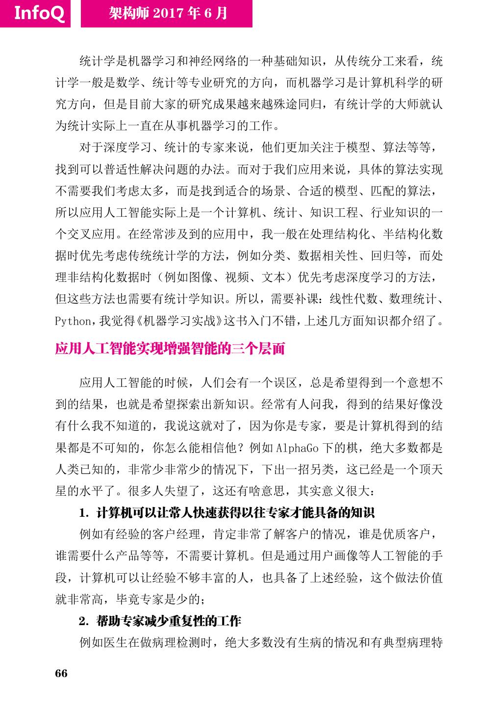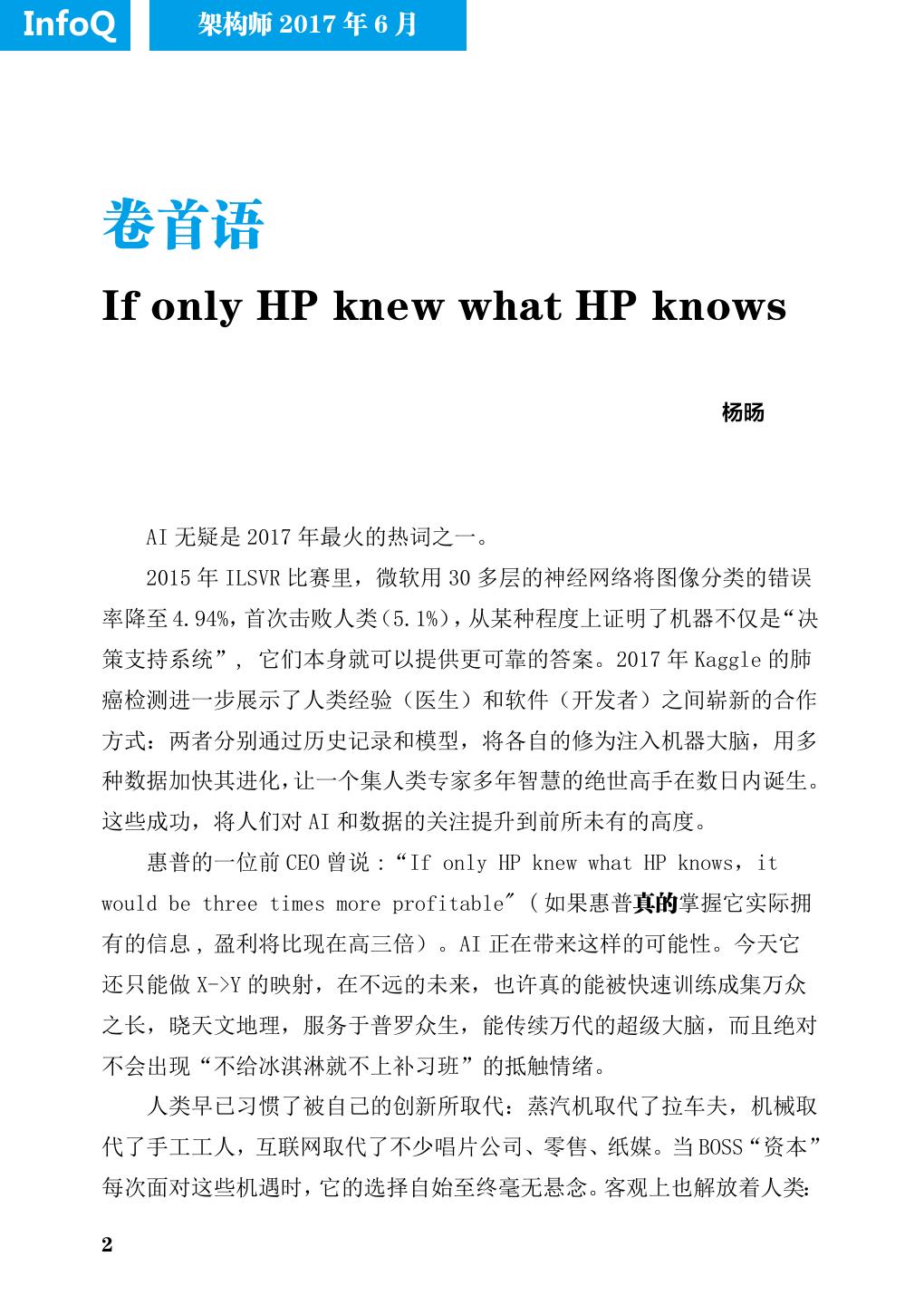 2 .InfoQ 架构师 2017 年 6 月 卷首语 If only HP knew what HP knows 杨旸 AI 无疑是 2017 年最火的热词之一。 2015 年 ILSVR 比赛里,微软用 30 多层的神经网络将图像分类的错误 率降至 4.94%,首次击败人类(5.1%),从某种程度上证明了机器不仅是“决 策支持系统”, 它们本身就可以提供更可靠的答案。2017 年 Kaggle 的肺 癌检测进一步展示了人类经验(医生)和软件(开发者)之间崭新的合作 方式:两者分别通过历史记录和模型,将各自的修为注入机器大脑,用多 种数据加快其进化,让一个集人类专家多年智慧的绝世高手在数日内诞生。 这些成功,将人们对 AI 和数据的关注提升到前所未有的高度。 惠普的一位前 CEO 曾说 :“If only HP knew what HP knows,it would be three times more profitable" ( 如果惠普真的掌握它实际拥 有的信息 , 盈利将比现在高三倍)。AI 正在带来这样的可能性。今天它 还只能做 X->Y 的映射,在不远的未来,也许真的能被快速训练成集万众 之长,晓天文地理,服务于普罗众生,能传续万代的超级大脑,而且绝对 不会出现“不给冰淇淋就不上补习班”的抵触情绪。 人类早已习惯了被自己的创新所取代:蒸汽机取代了拉车夫,机械取 代了手工工人,互联网取代了不少唱片公司、零售、纸媒。当 BOSS“资本” 每次面对这些机遇时,它的选择自始至终毫无悬念。客观上也解放着人类: 2