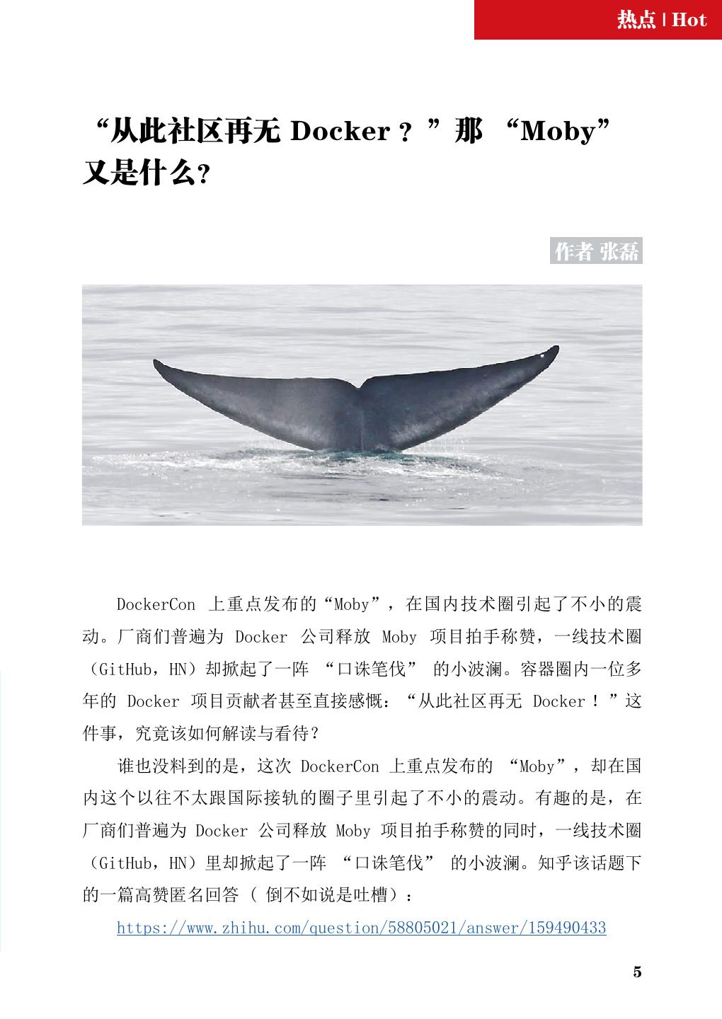 5 . 专题 热点| Topic | Hot “从此社区再无 Docker ?”那 “Moby” 又是什么? 作者 张磊 DockerCon 上重点发布的“Moby”,在国内技术圈引起了不小的震 动。厂商们普遍为 Docker 公司释放 Moby 项目拍手称赞,一线技术圈 (GitHub,HN)却掀起了一阵 “口诛笔伐” 的小波澜。容器圈内一位多 年的 Docker 项目贡献者甚至直接感慨:“从此社区再无 Docker !”这 件事,究竟该如何解读与看待? 谁也没料到的是,这次 DockerCon 上重点发布的 “Moby”,却在国 内这个以往不太跟国际接轨的圈子里引起了不小的震动。有趣的是,在 厂商们普遍为 Docker 公司释放 Moby 项目拍手称赞的同时,一线技术圈 (GitHub,HN)里却掀起了一阵 “口诛笔伐” 的小波澜。知乎该话题下 的一篇高赞匿名回答 ( 倒不如说是吐槽): https://www.zhihu.com/question/58805021/answer/159490433 5