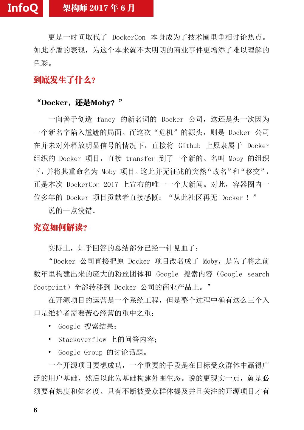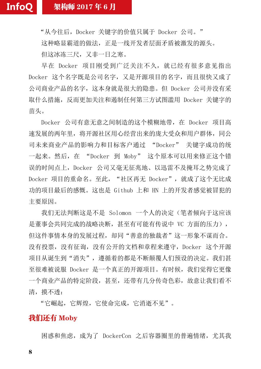 6 .InfoQ 架构师 2017 年 6 月 更是一时间取代了 DockerCon 本身成为了技术圈里争相讨论热点。 如此矛盾的表现,为这个本来就不太明朗的商业事件更增添了难以理解的 色彩。 到底发生了什么? “Docker,还是Moby?” 一向善于创造 fancy 的新名词的 Docker 公司,这还是头一次因为 一个新名字陷入尴尬的局面。而这次“危机”的源头,则是 Docker 公司 在并未对外释放明显信号的情况下,直接将 Github 上原隶属于 Docker 组织的 Docker 项目,直接 transfer 到了一个新的、名叫 Moby 的组织 下,并将其重命名为 Moby 项目。这此并无征兆的突然“改名”和“移交”, 正是本次 DockerCon 2017 上宣布的唯一一个大新闻。对此,容器圈内一 位多年的 Docker 项目贡献者直接感慨:“从此社区再无 Docker !” 说的一点没错。 究竟如何解读? 实际上,知乎回答的总结部分已经一针见血了: “Docker 公司直接把原 Docker 项目改名成了 Moby,是为了将之前 数年里构建出来的庞大的粉丝团体和 Google 搜索内容(Google search footprint)全部转移到 Docker 公司的商业产品上。” 在开源项目的运营是一个系统工程,但是整个过程中确有这么三个入 口是维护者需要苦心经营的重中之重: • Google 搜索结果; • Stackoverflow 上的问答内容; • Google Group 的讨论话题。 一个开源项目要想成功,一个重要的手段是在目标受众群体中赢得广 泛的用户基础,然后以此为基础构建外围生态。说的更现实一点,就是必 须要有热度和知名度。只有不断被受众群体提及并且关注的开源项目才有 6