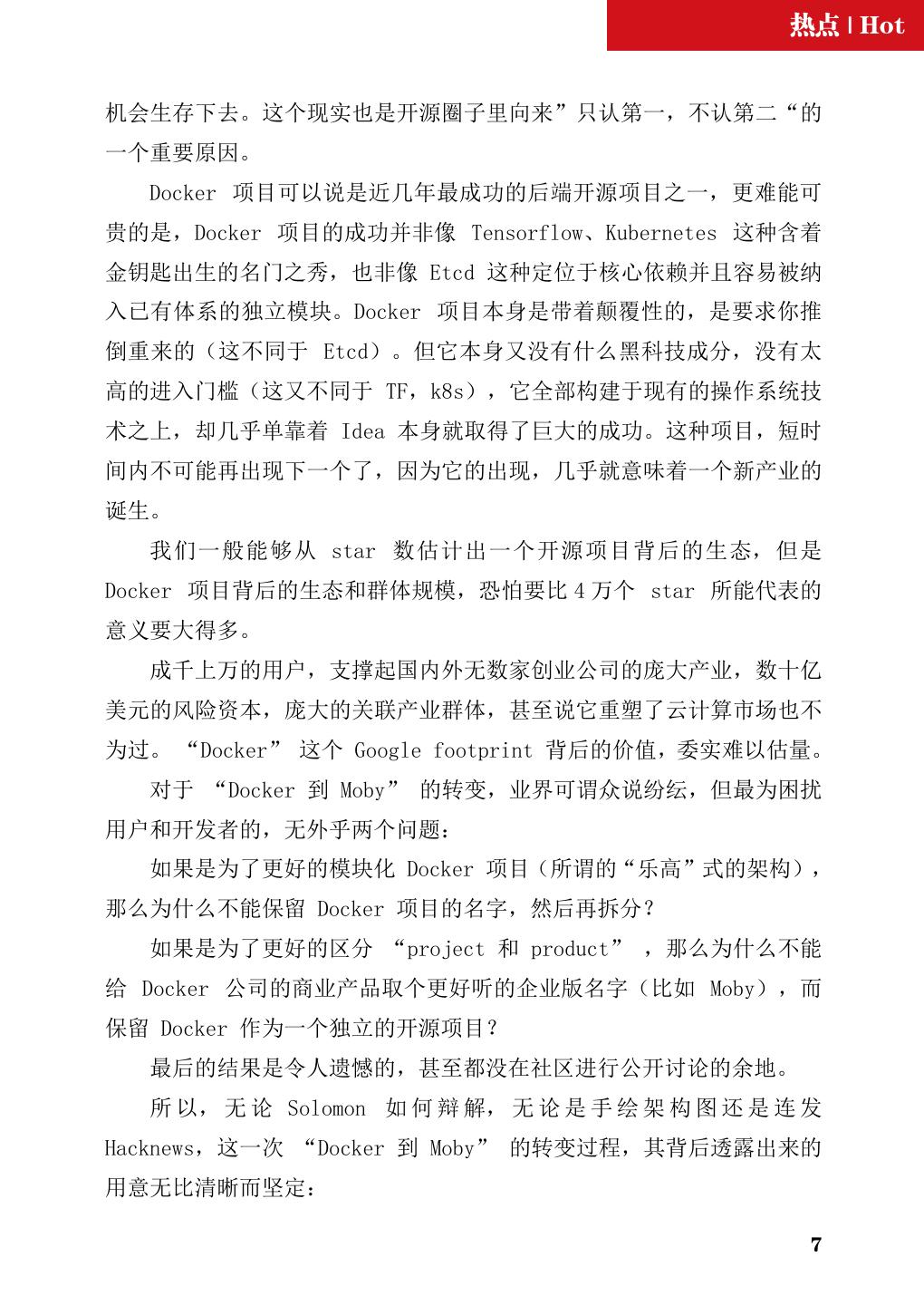 7 . 专题 热点| Topic | Hot 机会生存下去。这个现实也是开源圈子里向来”只认第一,不认第二“的 一个重要原因。 Docker 项目可以说是近几年最成功的后端开源项目之一,更难能可 贵的是,Docker 项目的成功并非像 Tensorflow、Kubernetes 这种含着 金钥匙出生的名门之秀,也非像 Etcd 这种定位于核心依赖并且容易被纳 入已有体系的独立模块。Docker 项目本身是带着颠覆性的,是要求你推 倒重来的(这不同于 Etcd)。但它本身又没有什么黑科技成分,没有太 高的进入门槛(这又不同于 TF,k8s),它全部构建于现有的操作系统技 术之上,却几乎单靠着 Idea 本身就取得了巨大的成功。这种项目,短时 间内不可能再出现下一个了,因为它的出现,几乎就意味着一个新产业的 诞生。 我们一般能够从 star 数估计出一个开源项目背后的生态,但是 Docker 项目背后的生态和群体规模,恐怕要比 4 万个 star 所能代表的 意义要大得多。 成千上万的用户,支撑起国内外无数家创业公司的庞大产业,数十亿 美元的风险资本,庞大的关联产业群体,甚至说它重塑了云计算市场也不 为过。 “Docker” 这个 Google footprint 背后的价值,委实难以估量。 对于 “Docker 到 Moby” 的转变,业界可谓众说纷纭,但最为困扰 用户和开发者的,无外乎两个问题: 如果是为了更好的模块化 Docker 项目(所谓的“乐高”式的架构), 那么为什么不能保留 Docker 项目的名字,然后再拆分? 如果是为了更好的区分 “project 和 product” ,那么为什么不能 给 Docker 公司的商业产品取个更好听的企业版名字(比如 Moby),而 保留 Docker 作为一个独立的开源项目? 最后的结果是令人遗憾的,甚至都没在社区进行公开讨论的余地。 所 以, 无 论 Solomon 如 何 辩 解, 无 论 是 手 绘 架 构 图 还 是 连 发 Hacknews,这一次 “Docker 到 Moby” 的转变过程,其背后透露出来的 用意无比清晰而坚定: 7