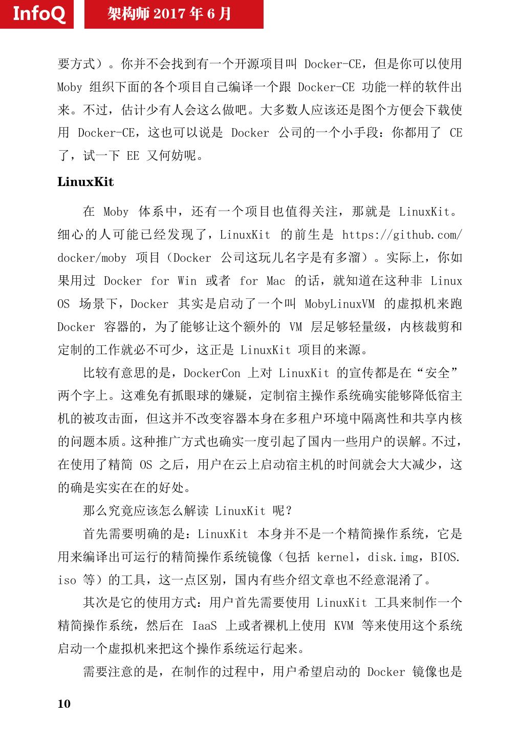 10 .InfoQ 架构师 2017 年 6 月 要方式)。你并不会找到有一个开源项目叫 Docker-CE,但是你可以使用 Moby 组织下面的各个项目自己编译一个跟 Docker-CE 功能一样的软件出 来。不过,估计少有人会这么做吧。大多数人应该还是图个方便会下载使 用 Docker-CE,这也可以说是 Docker 公司的一个小手段:你都用了 CE 了,试一下 EE 又何妨呢。 LinuxKit 在 Moby 体系中,还有一个项目也值得关注,那就是 LinuxKit。 细心的人可能已经发现了,LinuxKit 的前生是 https://github.com/ docker/moby 项目(Docker 公司这玩儿名字是有多溜)。实际上,你如 果用过 Docker for Win 或者 for Mac 的话,就知道在这种非 Linux OS 场景下,Docker 其实是启动了一个叫 MobyLinuxVM 的虚拟机来跑 Docker 容器的,为了能够让这个额外的 VM 层足够轻量级,内核裁剪和 定制的工作就必不可少,这正是 LinuxKit 项目的来源。 比较有意思的是,DockerCon 上对 LinuxKit 的宣传都是在“安全” 两个字上。这难免有抓眼球的嫌疑,定制宿主操作系统确实能够降低宿主 机的被攻击面,但这并不改变容器本身在多租户环境中隔离性和共享内核 的问题本质。这种推广方式也确实一度引起了国内一些用户的误解。不过, 在使用了精简 OS 之后,用户在云上启动宿主机的时间就会大大减少,这 的确是实实在在的好处。 那么究竟应该怎么解读 LinuxKit 呢? 首先需要明确的是:LinuxKit 本身并不是一个精简操作系统,它是 用来编译出可运行的精简操作系统镜像(包括 kernel,disk.img,BIOS. iso 等)的工具,这一点区别,国内有些介绍文章也不经意混淆了。 其次是它的使用方式:用户首先需要使用 LinuxKit 工具来制作一个 精简操作系统,然后在 IaaS 上或者裸机上使用 KVM 等来使用这个系统 启动一个虚拟机来把这个操作系统运行起来。 需要注意的是,在制作的过程中,用户希望启动的 Docker 镜像也是 10