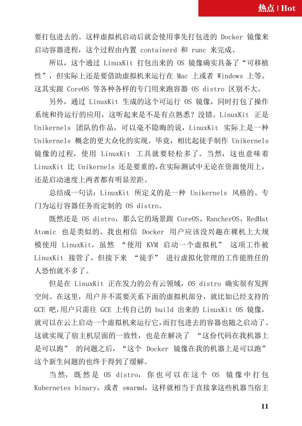 11 . 专题 热点| Topic | Hot 要打包进去的。这样虚拟机启动后就会使用事先打包进的 Docker 镜像来 启动容器进程,这个过程由内置 containerd 和 runc 来完成。 所以,这个通过 LinuxKit 打包出来的 OS 镜像确实具备了“可移植 性”,但实际上还是要借助虚拟机来运行在 Mac 上或者 Windows 上等。 这其实跟 CoreOS 等各种各样的专门用来跑容器 OS distro 区别不大。 另外,通过 LinuxKit 生成的这个可运行 OS 镜像,同时打包了操作 系统和待运行的应用,这听起来是不是有点熟悉?没错。LinuxKit 正是 Unikernels 团队的作品,可以毫不隐晦的说,LinuxKit 实际上是一种 Unikernels 概念的更大众化的实现。毕竟,相比起徒手制作 Unikernels 镜像的过程,使用 LinuxKit 工具就要轻松多了。当然,这也意味着 LinuxKit 比 Unikernels 还是要重的,在实际测试中无论在资源使用上, 还是启动速度上两者都有明显差距。 总结成一句话:LinuxKit 所定义的是一种 Unikernels 风格的、专 门为运行容器任务而定制的 OS distro。 既然还是 OS distro,那么它的场景跟 CoreOS、RancherOS、RedHat Atomic 也是类似的。我也相信 Docker 用户应该没兴趣在裸机上大规 模使用 LinuxKit,虽然 “使用 KVM 启动一个虚拟机” 这项工作被 LinuxKit 接管了,但接下来 “徒手” 进行虚拟化管理的工作能胜任的 人恐怕就不多了。 但是在 LinuxKit 正在发力的公有云领域,OS distro 确实很有发挥 空间。在这里,用户并不需要关系下面的虚拟机部分,就比如已经支持的 GCE 吧,用户只需往 GCE 上传自己的 build 出来的 LinuxKit OS 镜像, 就可以在云上启动一个虚拟机来运行它,而打包进去的容器也随之启动了。 这就实现了宿主机层面的一致性,也是在解决了 “这份代码在我机器上 是可以跑” 的问题之后,“这个 Docker 镜像在我的机器上是可以跑” 这个新生问题的也终于得到了缓解。 当 然, 既 然 是 OS distro, 你 也 可 以 在 这 个 OS 镜 像 中 打 包 Kubernetes binary,或者 swarmd,这样就相当于直接拿这些机器当宿主 11