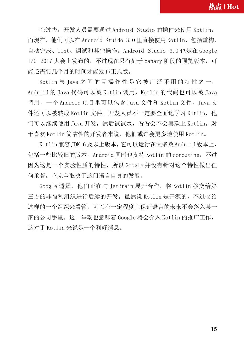 15 . 专题 热点| Topic | Hot 在过去,开发人员需要通过 Android Studio 的插件来使用 Kotlin, 而现在,他们可以在 Android Stuido 3.0 里直接使用 Kotlin,包括重构、 自动完成、lint、调试和其他操作。Android Studio 3.0 也是在 Google I/O 2017 大会上发布的,不过现在只有处于 canary 阶段的预览版本,可 能还需要几个月的时间才能发布正式版。 Kotlin 与 Java 之 间 的 互 操 作 性 是 它 被 广 泛 采 用 的 特 性 之 一。 Android 的 Java 代码可以被 Kotlin 调用,Kotlin 的代码也可以被 Java 调用,一个 Android 项目里可以包含 Java 文件和 Kotlin 文件,Java 文 件还可以被转成 Kotlin 文件。开发人员不一定要全面地学习 Kotlin,他 们可以继续使用 Java 开发,然后试试水,看看会不会喜欢上 Kotlin。对 于喜欢 Kotlin 简洁性的开发者来说,他们或许会更多地使用 Kotlin。 Kotlin 兼容 JDK 6 及以上版本,它可以运行在大多数 Android 版本上, 包括一些比较旧的版本。Android 同时也支持 Kotlin 的 coroutine,不过 因为这是一个实验性质的特性,所以 Google 并没有针对这个特性做出任 何承若,它完全取决于这门语言自身的发展。 Google 透露,他们正在与 JetBrain 展开合作,将 Kotlin 移交给第 三方的非盈利组织进行后续的开发。虽然说 Kotlin 是开源的,不过交给 这样的一个组织来看管,可以在一定程度上保证语言的未来不会落入某一 家的公司手里。这一举动也意味着 Google 将会介入 Kotlin 的推广工作, 这对于 Kotlin 来说是一个利好消息。 15