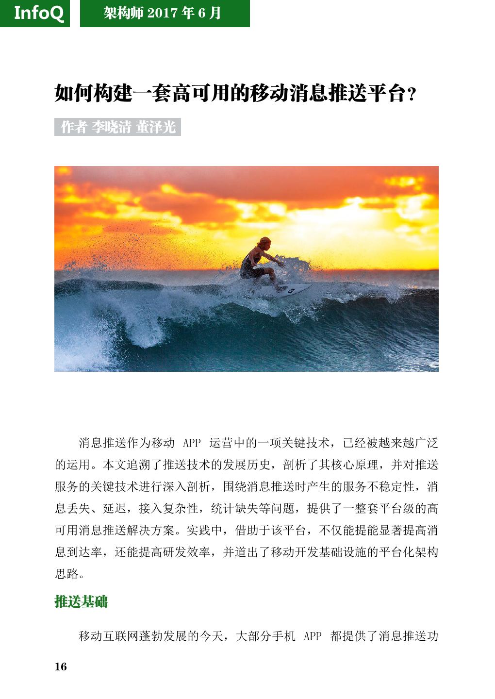 16 .InfoQ 架构师 2017 年 6 月 如何构建一套高可用的移动消息推送平台? 作者 李晓清 董泽光 消息推送作为移动 APP 运营中的一项关键技术,已经被越来越广泛 的运用。本文追溯了推送技术的发展历史,剖析了其核心原理,并对推送 服务的关键技术进行深入剖析,围绕消息推送时产生的服务不稳定性,消 息丢失、延迟,接入复杂性,统计缺失等问题,提供了一整套平台级的高 可用消息推送解决方案。实践中,借助于该平台,不仅能提能显著提高消 息到达率,还能提高研发效率,并道出了移动开发基础设施的平台化架构 思路。 推送基础 移动互联网蓬勃发展的今天,大部分手机 APP 都提供了消息推送功 16