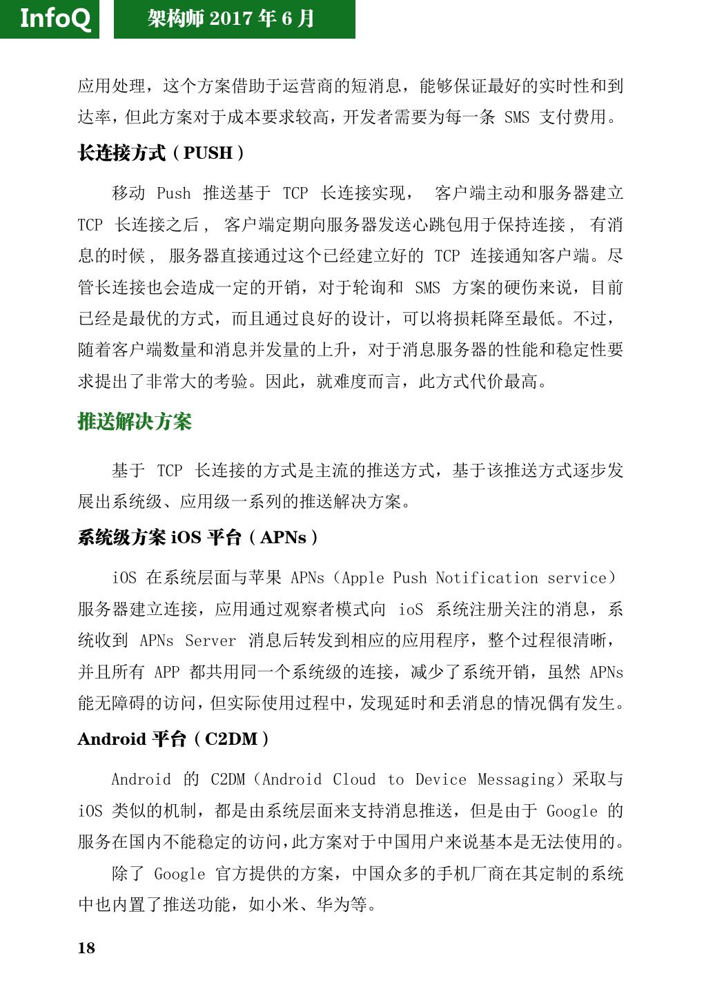18 .InfoQ 架构师 2017 年 6 月 应用处理,这个方案借助于运营商的短消息,能够保证最好的实时性和到 达率,但此方案对于成本要求较高,开发者需要为每一条 SMS 支付费用。 长连接方式(PUSH) 移动 Push 推送基于 TCP 长连接实现, 客户端主动和服务器建立 TCP 长连接之后 , 客户端定期向服务器发送心跳包用于保持连接 , 有消 息的时候 , 服务器直接通过这个已经建立好的 TCP 连接通知客户端。尽 管长连接也会造成一定的开销,对于轮询和 SMS 方案的硬伤来说,目前 已经是最优的方式,而且通过良好的设计,可以将损耗降至最低。不过, 随着客户端数量和消息并发量的上升,对于消息服务器的性能和稳定性要 求提出了非常大的考验。因此,就难度而言,此方式代价最高。 推送解决方案 基于 TCP 长连接的方式是主流的推送方式,基于该推送方式逐步发 展出系统级、应用级一系列的推送解决方案。 系统级方案 iOS 平台(APNs) iOS 在系统层面与苹果 APNs(Apple Push Notification service) 服务器建立连接,应用通过观察者模式向 ioS 系统注册关注的消息,系 统收到 APNs Server 消息后转发到相应的应用程序,整个过程很清晰, 并且所有 APP 都共用同一个系统级的连接,减少了系统开销,虽然 APNs 能无障碍的访问,但实际使用过程中,发现延时和丢消息的情况偶有发生。 Android 平台(C2DM) Android 的 C2DM(Android Cloud to Device Messaging)采取与 iOS 类似的机制,都是由系统层面来支持消息推送,但是由于 Google 的 服务在国内不能稳定的访问,此方案对于中国用户来说基本是无法使用的。 除了 Google 官方提供的方案,中国众多的手机厂商在其定制的系统 中也内置了推送功能,如小米、华为等。 18