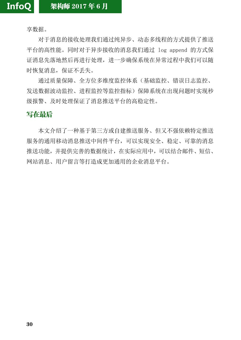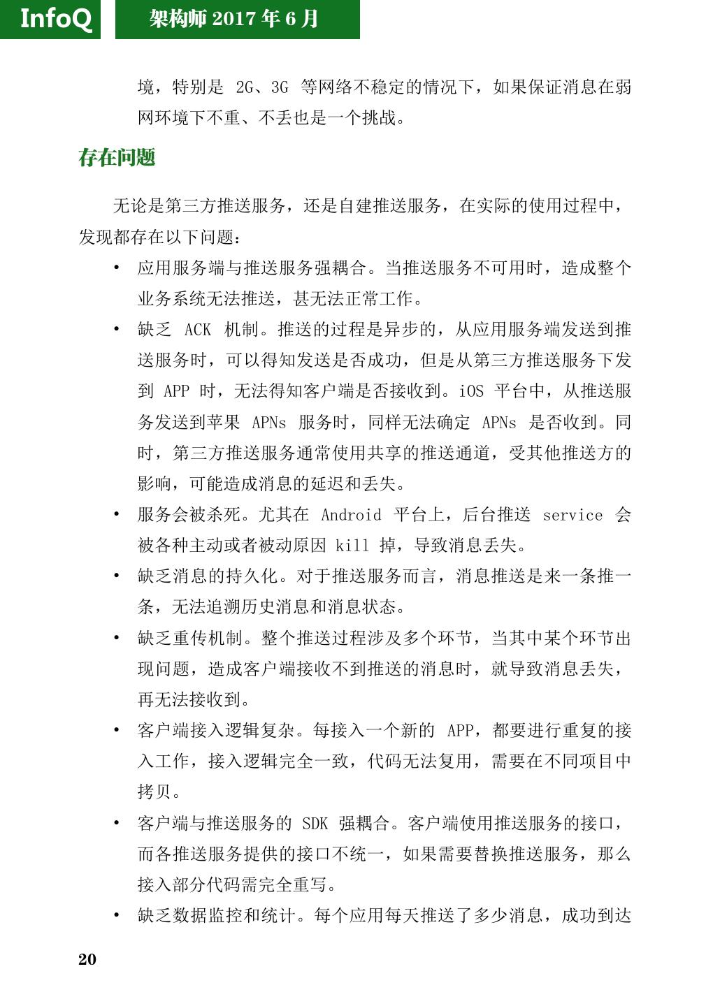 20 .InfoQ 架构师 2017 年 6 月 境,特别是 2G、3G 等网络不稳定的情况下,如果保证消息在弱 网环境下不重、不丢也是一个挑战。 存在问题 无论是第三方推送服务,还是自建推送服务,在实际的使用过程中, 发现都存在以下问题: • 应用服务端与推送服务强耦合。当推送服务不可用时,造成整个 业务系统无法推送,甚无法正常工作。 • 缺乏 ACK 机制。推送的过程是异步的,从应用服务端发送到推 送服务时,可以得知发送是否成功,但是从第三方推送服务下发 到 APP 时,无法得知客户端是否接收到。iOS 平台中,从推送服 务发送到苹果 APNs 服务时,同样无法确定 APNs 是否收到。同 时,第三方推送服务通常使用共享的推送通道,受其他推送方的 影响,可能造成消息的延迟和丢失。 • 服务会被杀死。尤其在 Android 平台上,后台推送 service 会 被各种主动或者被动原因 kill 掉,导致消息丢失。 • 缺乏消息的持久化。对于推送服务而言,消息推送是来一条推一 条,无法追溯历史消息和消息状态。 • 缺乏重传机制。整个推送过程涉及多个环节,当其中某个环节出 现问题,造成客户端接收不到推送的消息时,就导致消息丢失, 再无法接收到。 • 客户端接入逻辑复杂。每接入一个新的 APP,都要进行重复的接 入工作,接入逻辑完全一致,代码无法复用,需要在不同项目中 拷贝。 • 客户端与推送服务的 SDK 强耦合。客户端使用推送服务的接口, 而各推送服务提供的接口不统一,如果需要替换推送服务,那么 接入部分代码需完全重写。 • 缺乏数据监控和统计。每个应用每天推送了多少消息,成功到达 20