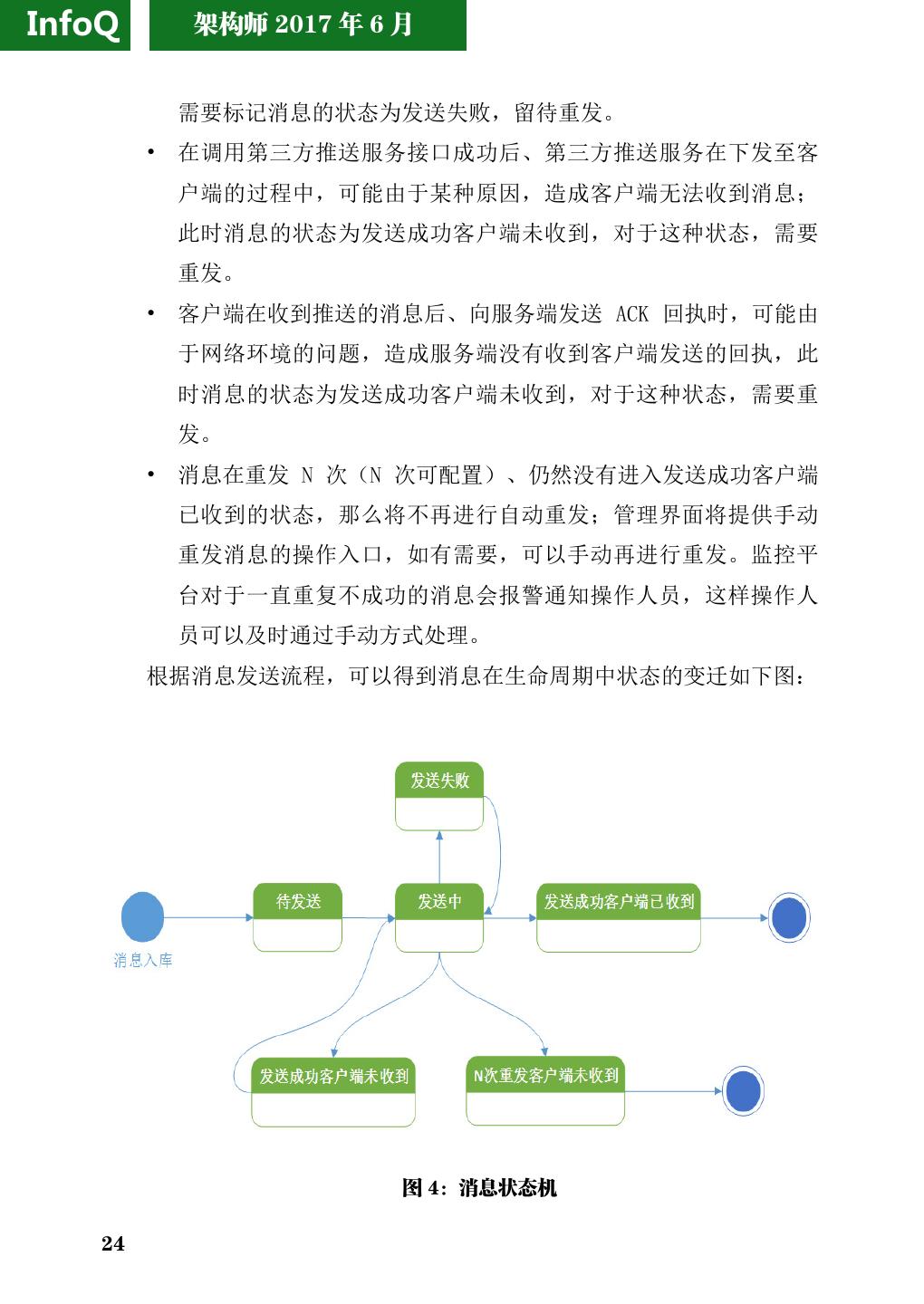 24 .InfoQ 架构师 2017 年 6 月 需要标记消息的状态为发送失败,留待重发。 • 在调用第三方推送服务接口成功后、第三方推送服务在下发至客 户端的过程中,可能由于某种原因,造成客户端无法收到消息; 此时消息的状态为发送成功客户端未收到,对于这种状态,需要 重发。 • 客户端在收到推送的消息后、向服务端发送 ACK 回执时,可能由 于网络环境的问题,造成服务端没有收到客户端发送的回执,此 时消息的状态为发送成功客户端未收到,对于这种状态,需要重 发。 • 消息在重发 N 次(N 次可配置)、仍然没有进入发送成功客户端 已收到的状态,那么将不再进行自动重发;管理界面将提供手动 重发消息的操作入口,如有需要,可以手动再进行重发。监控平 台对于一直重复不成功的消息会报警通知操作人员,这样操作人 员可以及时通过手动方式处理。 根据消息发送流程,可以得到消息在生命周期中状态的变迁如下图: 图 4:消息状态机 24