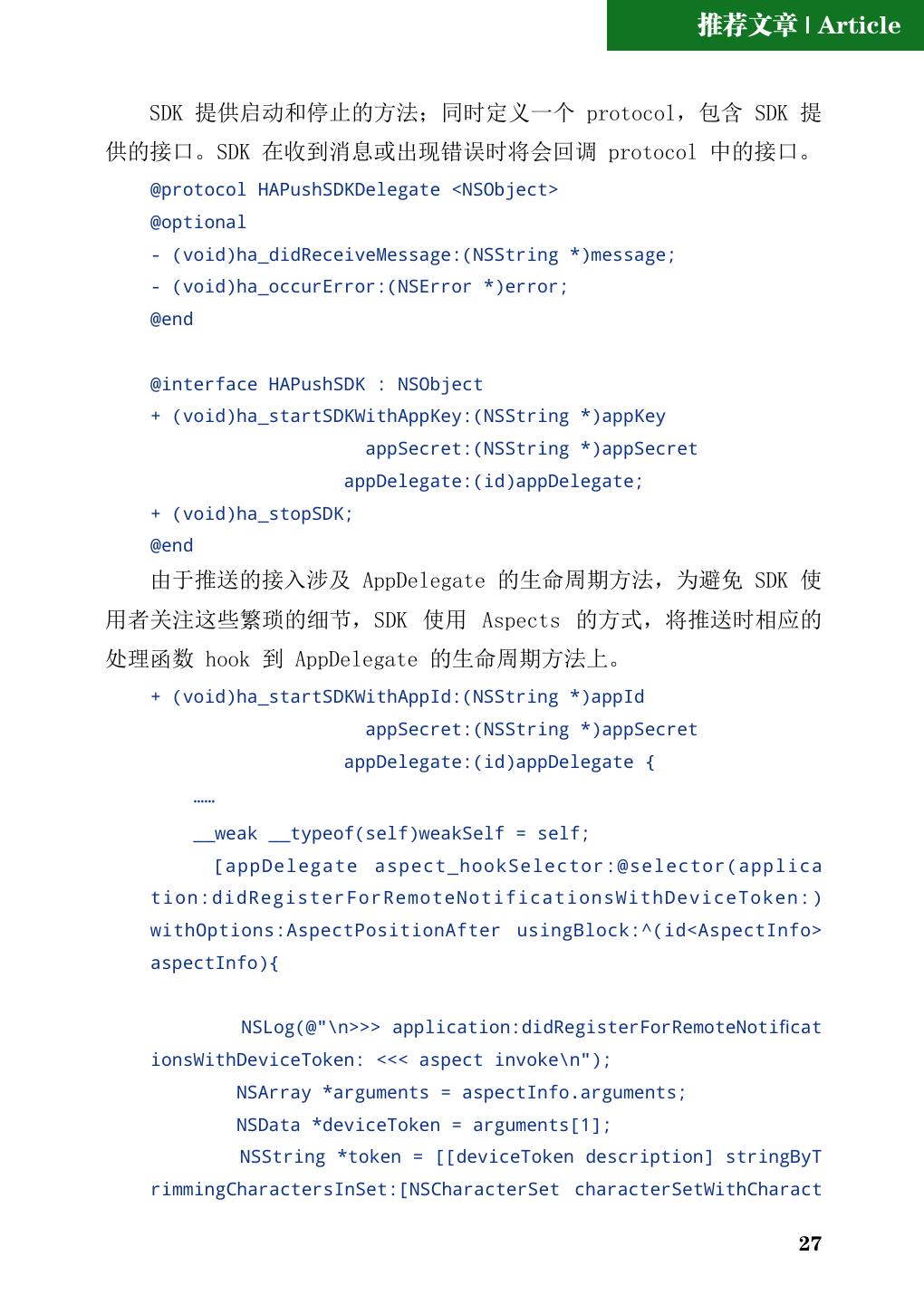 27 . 推荐文章 | Article SDK 提供启动和停止的方法;同时定义一个 protocol,包含 SDK 提 供的接口。SDK 在收到消息或出现错误时将会回调 protocol 中的接口。 @protocol HAPushSDKDelegate <NSObject> @optional - (void)ha_didReceiveMessage:(NSString *)message; - (void)ha_occurError:(NSError *)error; @end @interface HAPushSDK : NSObject + (void)ha_startSDKWithAppKey:(NSString *)appKey appSecret:(NSString *)appSecret appDelegate:(id)appDelegate; + (void)ha_stopSDK; @end 由于推送的接入涉及 AppDelegate 的生命周期方法,为避免 SDK 使 用者关注这些繁琐的细节,SDK 使用 Aspects 的方式,将推送时相应的 处理函数 hook 到 AppDelegate 的生命周期方法上。 + (void)ha_startSDKWithAppId:(NSString *)appId appSecret:(NSString *)appSecret appDelegate:(id)appDelegate { …… __weak __typeof(self)weakSelf = self; [appDelegate aspect_hookSelector:@selector(applica tion:didRegisterForRemoteNotificationsWithDeviceToken:) withOptions:AspectPositionAfter usingBlock:^(id<AspectInfo> aspectInfo){ NSLog(@"\n>>> application:didRegisterForRemoteNotificat ionsWithDeviceToken: <<< aspect invoke\n"); NSArray *arguments = aspectInfo.arguments; NSData *deviceToken = arguments[1]; NSString *token = [[deviceToken description] stringByT rimmingCharactersInSet:[NSCharacterSet characterSetWithCharact 27