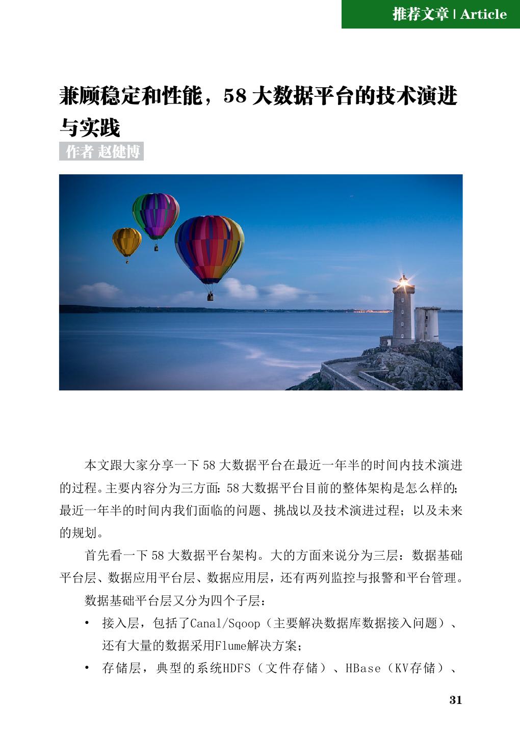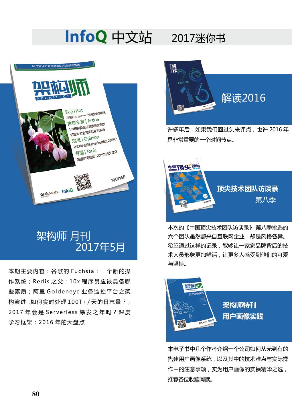 4 . CONTENTS / 目录 热点 | Hot “从此社区再无 Docker ?” 那 “Moby” 又是什么? Kotlin 成为正式的 Android 编程语言 推荐文章 | Article 如何构建一套高可用的移动消息推送平台? 兼顾稳定和性能,58 大数据平台的技术演进与实践 阿里巴巴为什么要选择星际争霸作为 AI 算法研究环境? 观点 | Opinion 人工智能与软件架构 架构师 2017 年 6 月刊 本期主编 杜小芳 提供反馈 feedback@cn.infoq.com 流程编辑 丁晓昀 商务合作 sales@cn.infoq.com 发行人 霍泰稳 内容合作 editors@cn.infoq.com 4