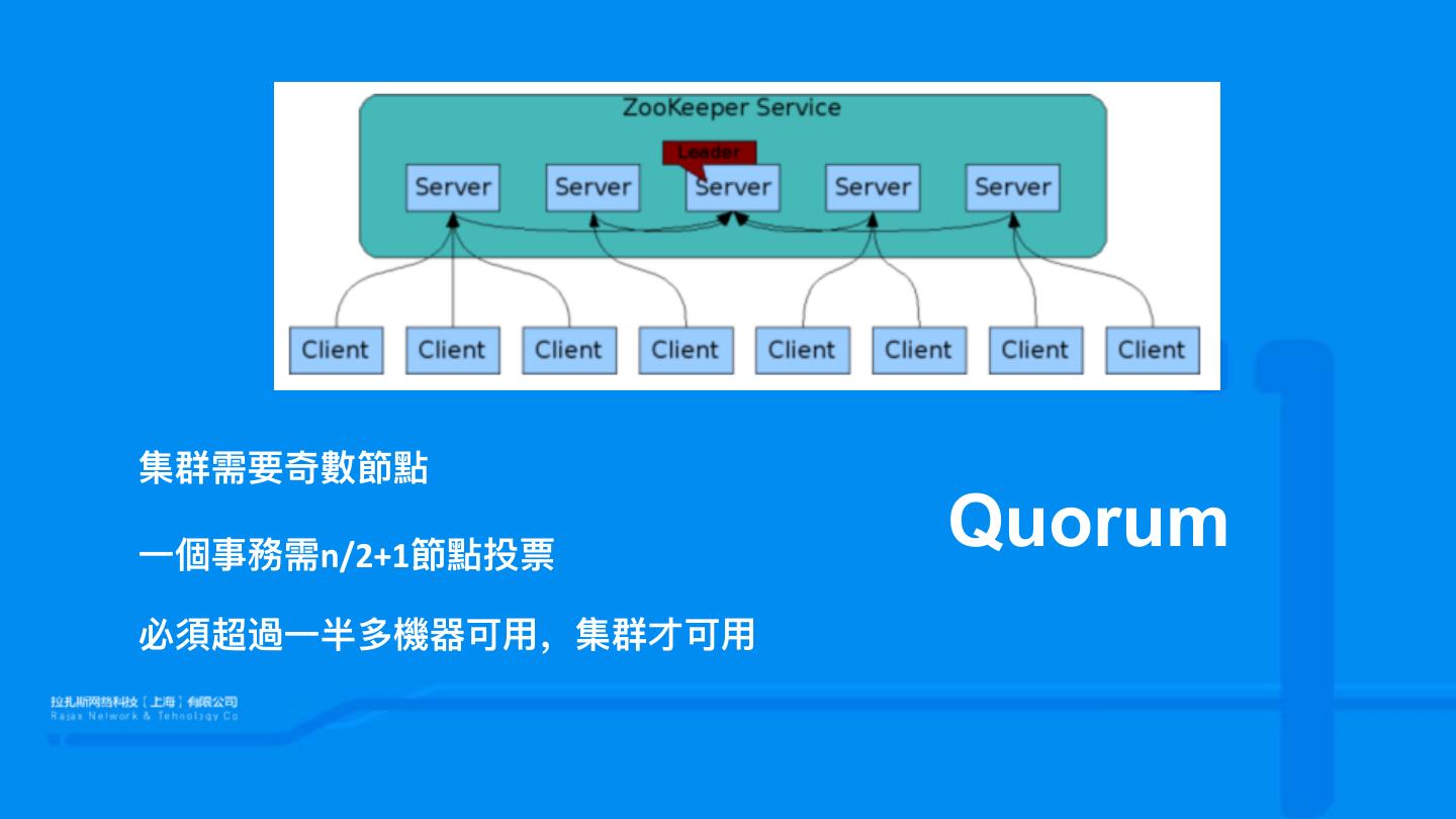 6 .集群需要奇數數節點 ⼀一個事務需n/2+1節點投票 Quorum 必須超過⼀一半多機器器可⽤用,集群才可⽤用