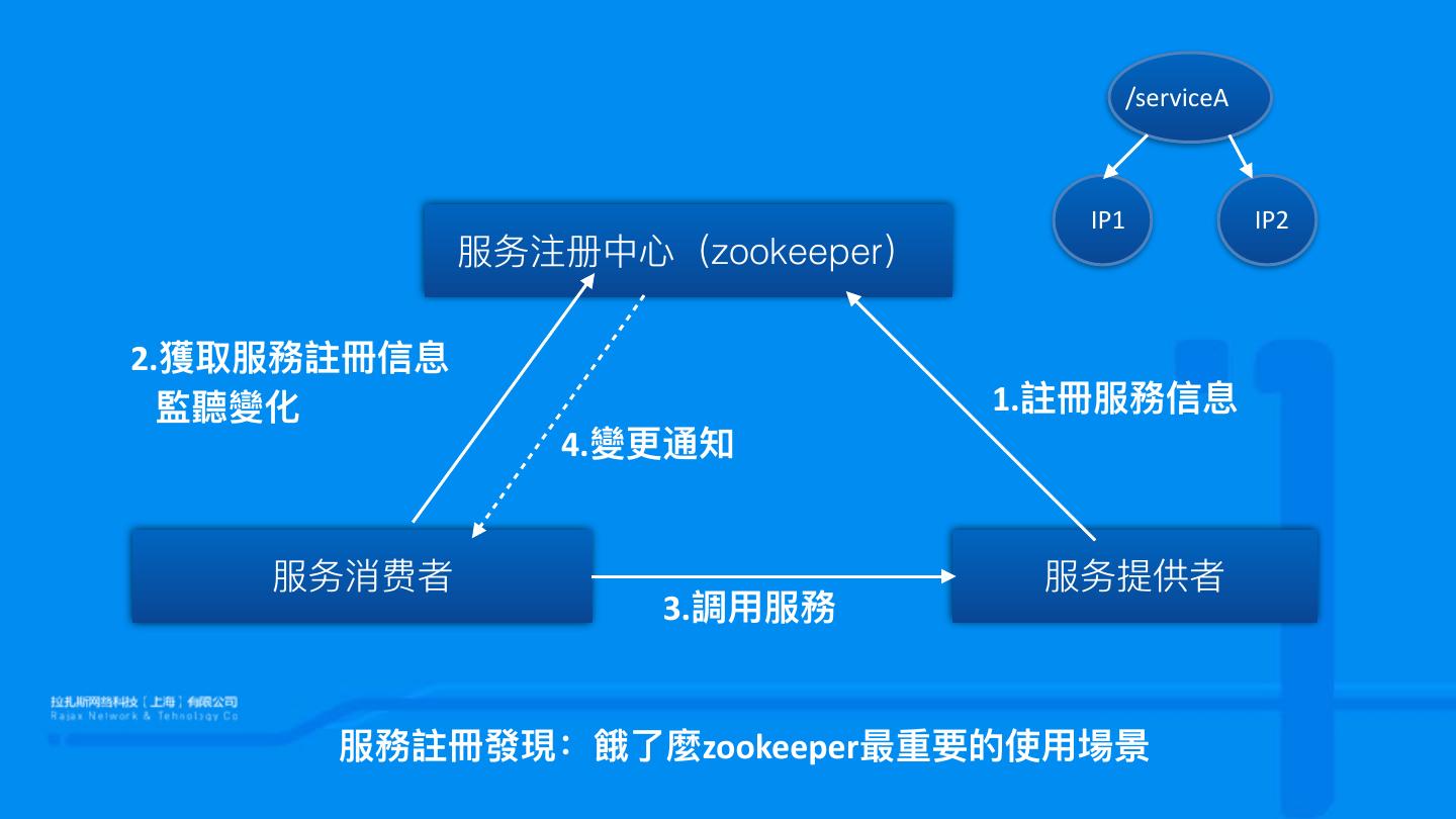 7 . /serviceA IP1 IP2 服务注册中⼼心(zookeeper) 2.獲取服務註冊信息 監聽變化 1.註冊服務信息 4.變更更通知 服务消费者 服务提供者 3.調⽤用服務 服務註冊發現:餓了了麼zookeeper最重要的使⽤用場景